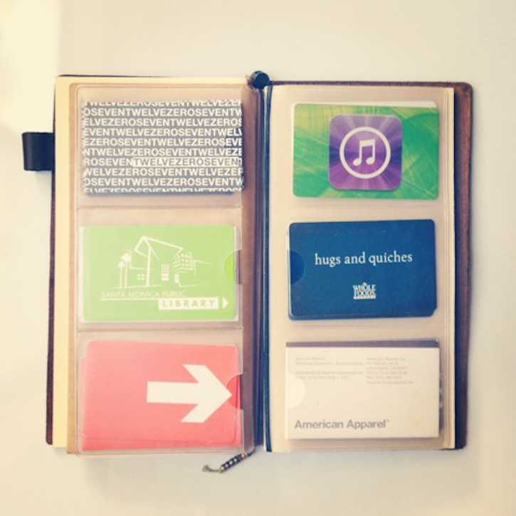 Aside from the weekly, monthly planners and a sketch book, I also use the Travelers Notebook as my secondary wallet. It holds all of my gift cards and business card contacts (using Card Holder and Kraft File). To personalize it, I beaded my bookmark string with brass beads and doubled up on the elastic band that I found at a local fabric store. I keep my special keepsakes in a brown Kraft Envelope with String (Small) on the inside pocket which are easily accessible and protected.