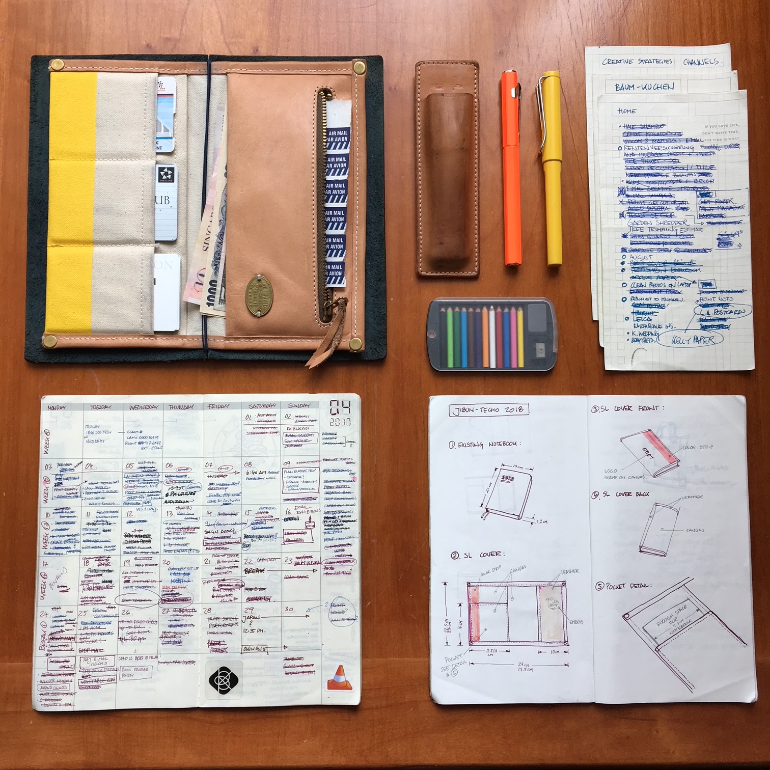 Currently, my analogue system is designed to support the different hats that I am wearing: I have a set-up for being organized which includes a Travelers notebook with a monthly calendar as well as BK Notebooks (“Make it yours” for sketches and several BK Dashboards for note-taking and to-do lists). I am using three at a time: one for the family, one for Baum-kuchen, and one for ArtCenter where I teach. I have entirely stopped using any form of digital calendar or other digital repositories such as Notes, etc.