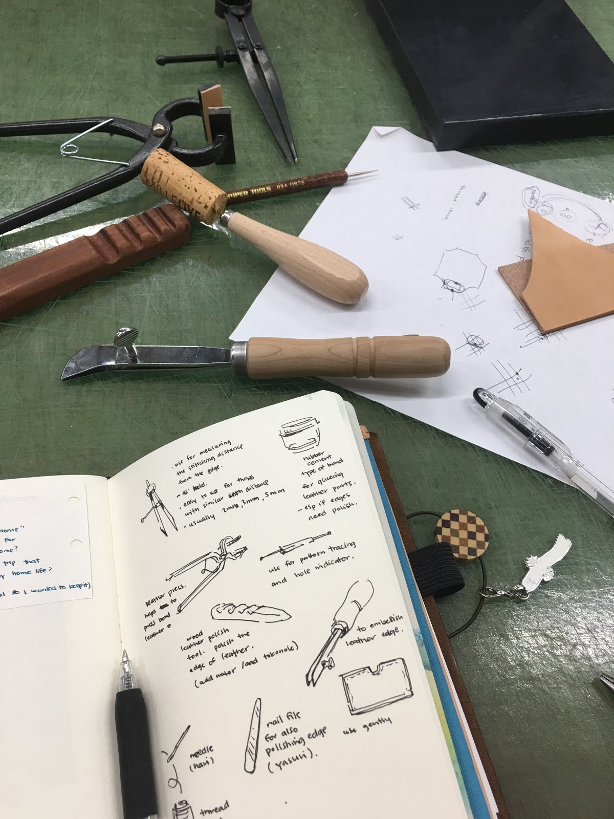 The factory is open from Tuesday through Saturday. Most mornings, I would go for a walk in the mountains first then head to the workshop. Every day during my stay, I was under Yanai-san’s tutelage. He taught me bit by bit and built me up to various aspects of the leather craft: leather carving, sewing leather, simple pattern making, and tools maintenance. Each day I did a little of everything, trying to improve on what I had learned the previous day. Learning how leather goods are made was a fascinating experience for me. It takes so much focus and precision to make anything because, with leather, there’s no second chance as opposed to canvas work. It often made me feel nervous! Yanai-san had to remind me to breathe all the time. Though it was challenging, I loved learning every part of it.