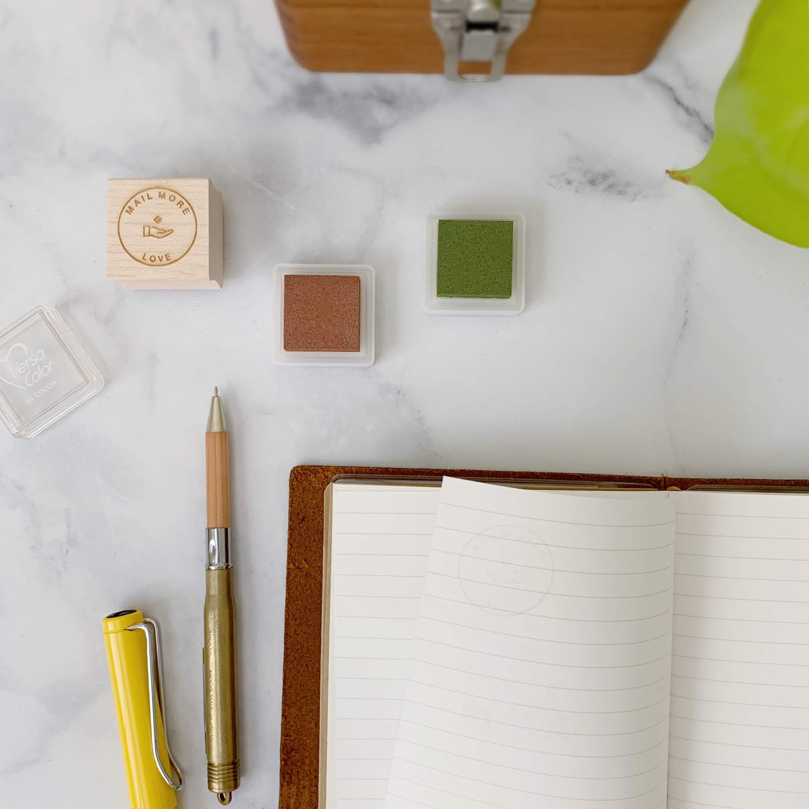 Sending snail mail via a postcard is an easy but thoughtful way to let someone know you are thinking of them. Many of us enjoy adding meaningful dashes of color with stamps. The Artnic ink pads worked very well with standard postcard paper with no feathering or bleed-through. Although those are important criteria, for me the most important factor when selecting an ink pad for snail mail is to ensure that the stamped images are not ruined during transit. The impressions can be smeared by water (rain) or being touched by many helpful hands until it is delivered. One of my favorite parts of the Artnic ink pads is that they are water and smear resistant once the ink has completely dried. This means that you can be assured that your snail mail art will not smudge once it has reached its destination. Just remember to pair it with a water-resistant pen! (Traveler's Company brass ballpoint pen works well).