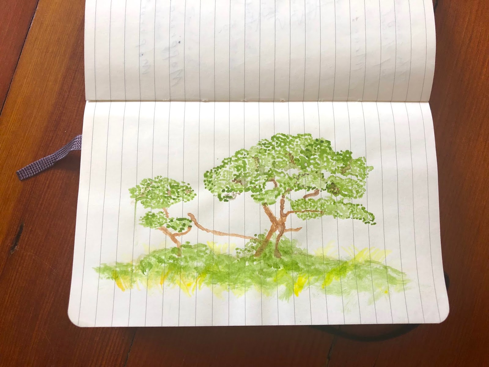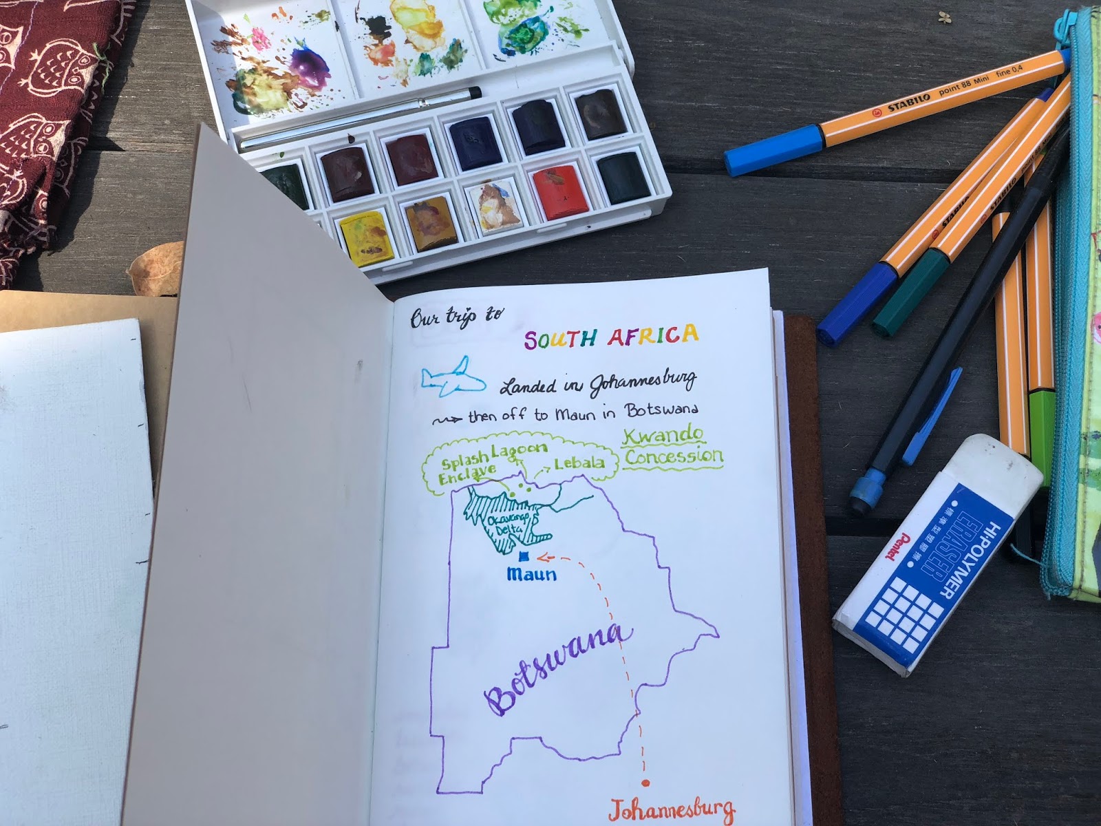 Belinda: I have to be honest, I didn’t think about journaling whilst traveling until I followed Wakako! Her posts are to die for and I really love everything about her account – the travels, the journaling, the homeschooling. Wakako’s analoguing with her family is so inspiring. I aspire for that routine so it was nice to have the siesta downtime in Africa to really dive in and capture some of our favorite moments via artwork. We basically took photos throughout the safaris and then came back and painted. One day, the hubby and I were painting the scenery just outside our camp and we actually ended up painting the same tree!