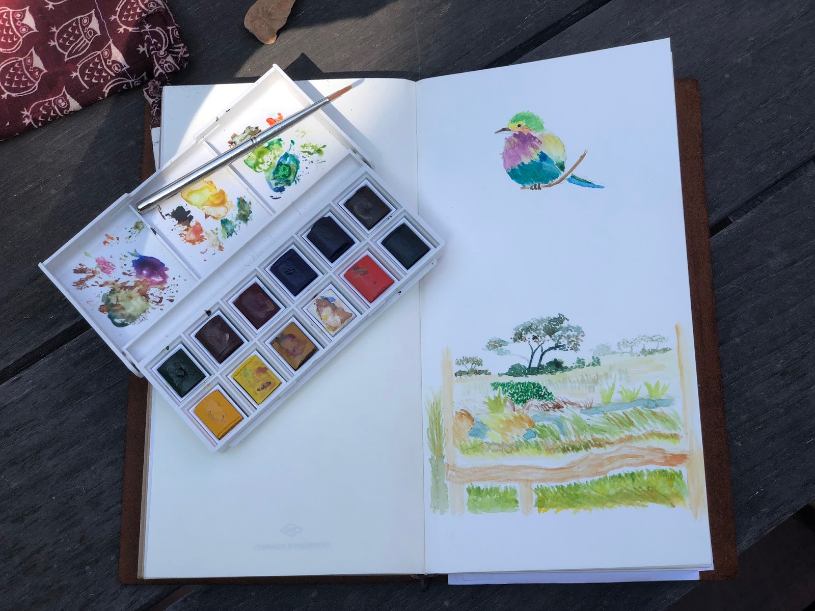Belinda: Oh man, I would just say lead by example. For me, it helped to have a special travel journal before our trip to Africa. Something that clearly looks different from any other old generic notebook – these journals from Baum-kuchen are beautiful and I love how they are customizable. Our paint kit is very small too so we keep the journal and the paint kit in a cloth bag that I sewed for us. For me, I think having a niece that is so organized with her journal will be an inspiration for my daughter as she grows older.