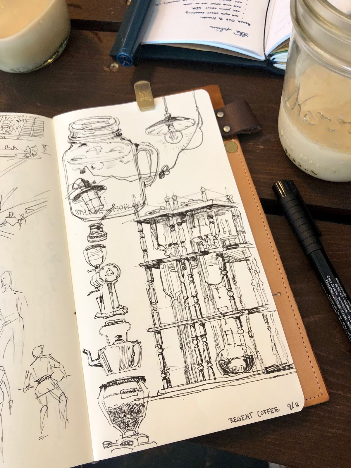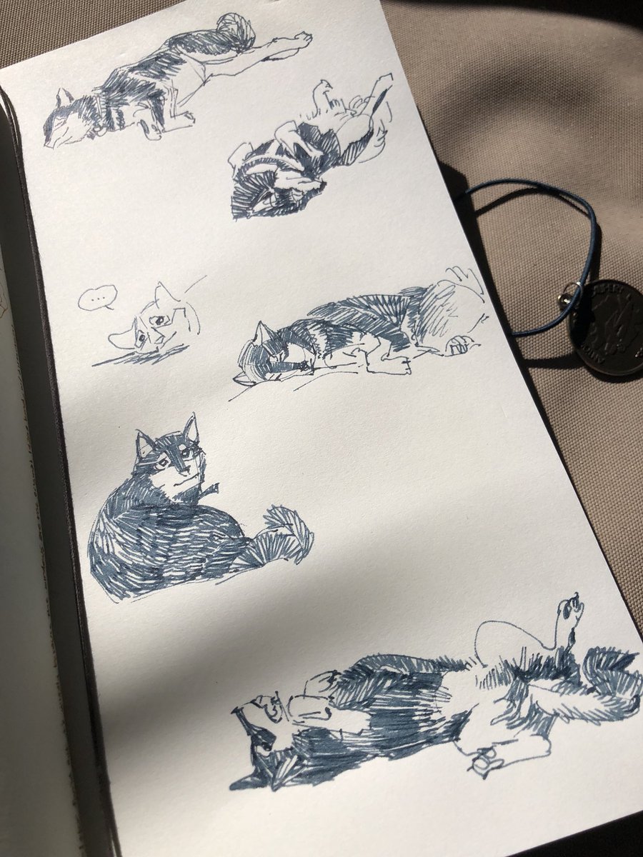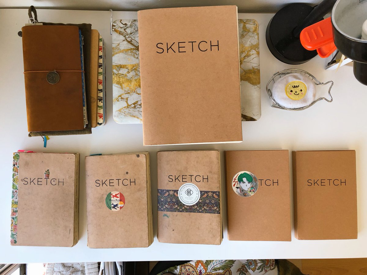 The other “lung” vital to my analogue system is made up of my sketchbooks, too numerous to list here. I reserve one large sketchbook for concept art and research for my graphic novel. There’s also a Moleskine-like book designed by my partner, which I use to draft proposals, pitches, emails, social media posts, etc. (seeing the weird tigers Emil drew on the cover makes me less reluctant to deal with the businesslike tasks inside lol). But the majority of my sketchbooks are a total hodgepodge.