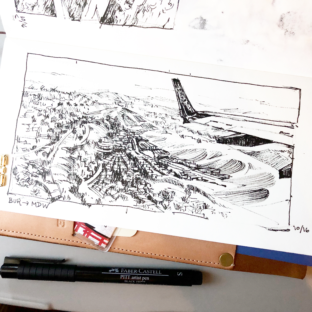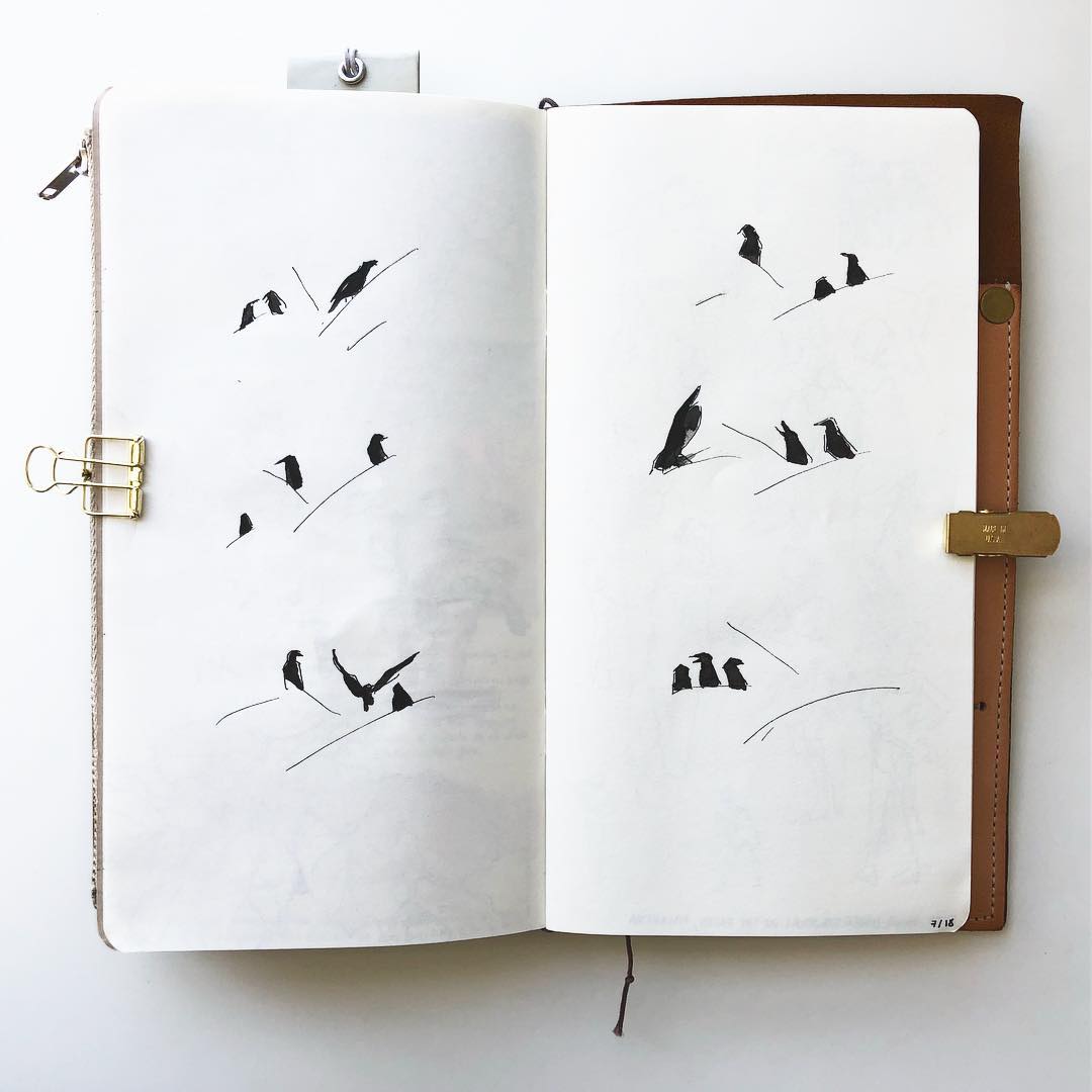 Maybe it’s because I arrange and fill little boxes on a page for a living, but my natural tendency is to draw from corner to corner on compositions and use lots of lines. It’s an effort to simplify. Sketching from life is great for that, especially ephemeral subjects in constant motion like birds, people or the view out of a plane/bus/train window.