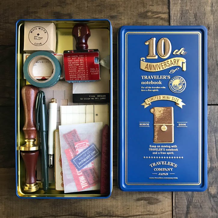 The idea here is to fill the tin with items you always need to mail a letter or postcard conveniently. TN 10th Anniversary tin can is the perfect size to fit correspondence artifacts! I love that when the tin can is closed with its lid, it's slim and can be stacked or put away in a bookshelf.