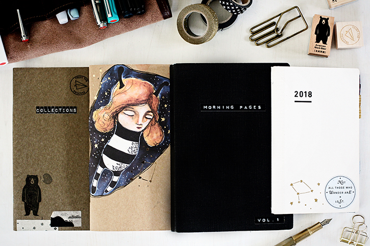She keeps her Morning Pages simple, only changing the pen she uses each day. Her personal journal is a free-for-all where she writes, sketches, watercolors and glues in bits from her daily life. It has been her main creative outlet for over a year and is now a part of her life forever.