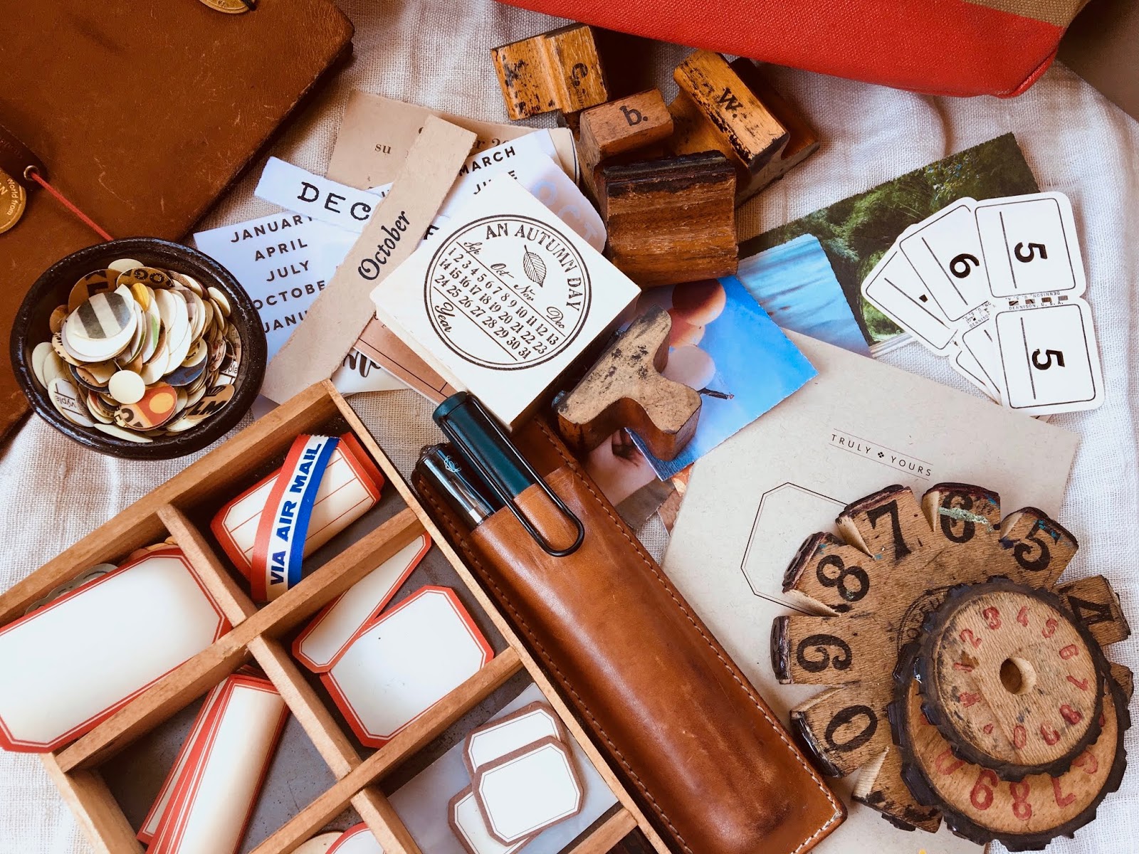 I used to take my babysitting money down to the local “dime store” and spend it on pens and pencils, stationery, notebooks, and office supplies! Now, I collect the same things, plus washi tape, stickers, vintage ephemera, and old books. I’m an artist and a bookbinder so I make art journals. I’ve always used a planner book of some kind. But, I really love Traveler’s Notebooks. I first started using Traveler’s Notebook around 2015. I got a brown Midori just before they changed the name to Traveler’s Notebook. I really treasure it.