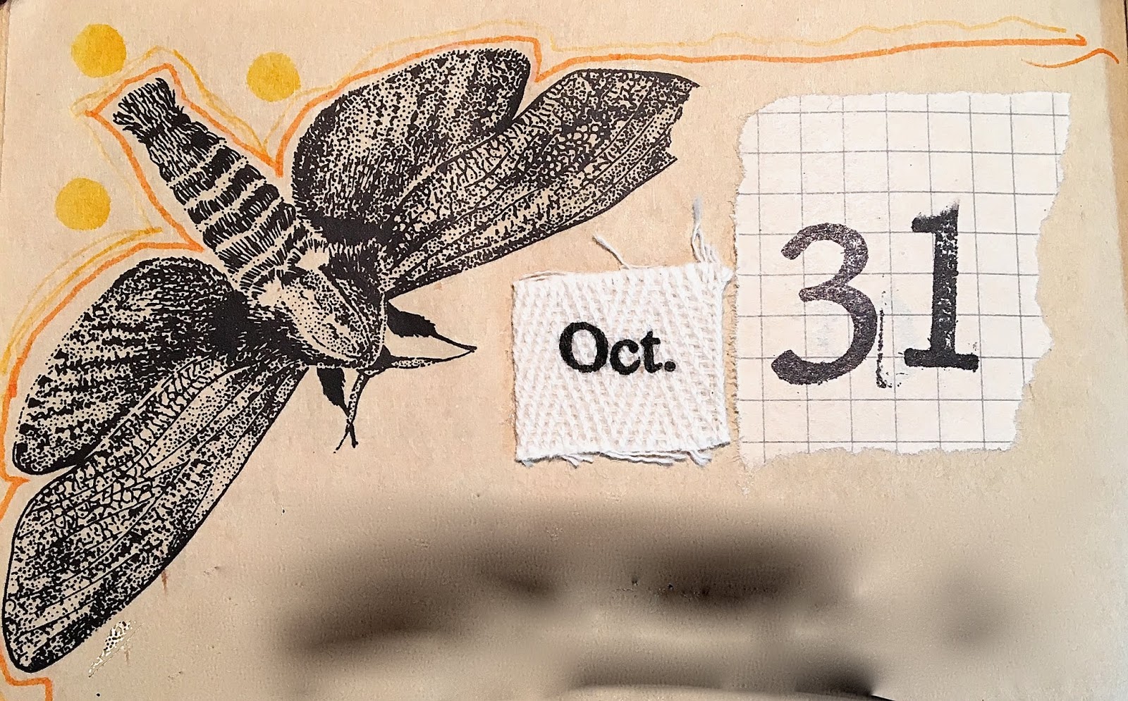 My signature move is to record the date on each page in a different and unique way. For this reason, I have containers holding various printed versions of months, numbers, and days of the week. I also tear up old calendars and save every page of my Japanese Sora moon phase calendar and the German mini calendar from Brunnen. So much fun to play with different formats. I often put washi tape under them and incorporate some of my many alpha/numeric stamp sets.
