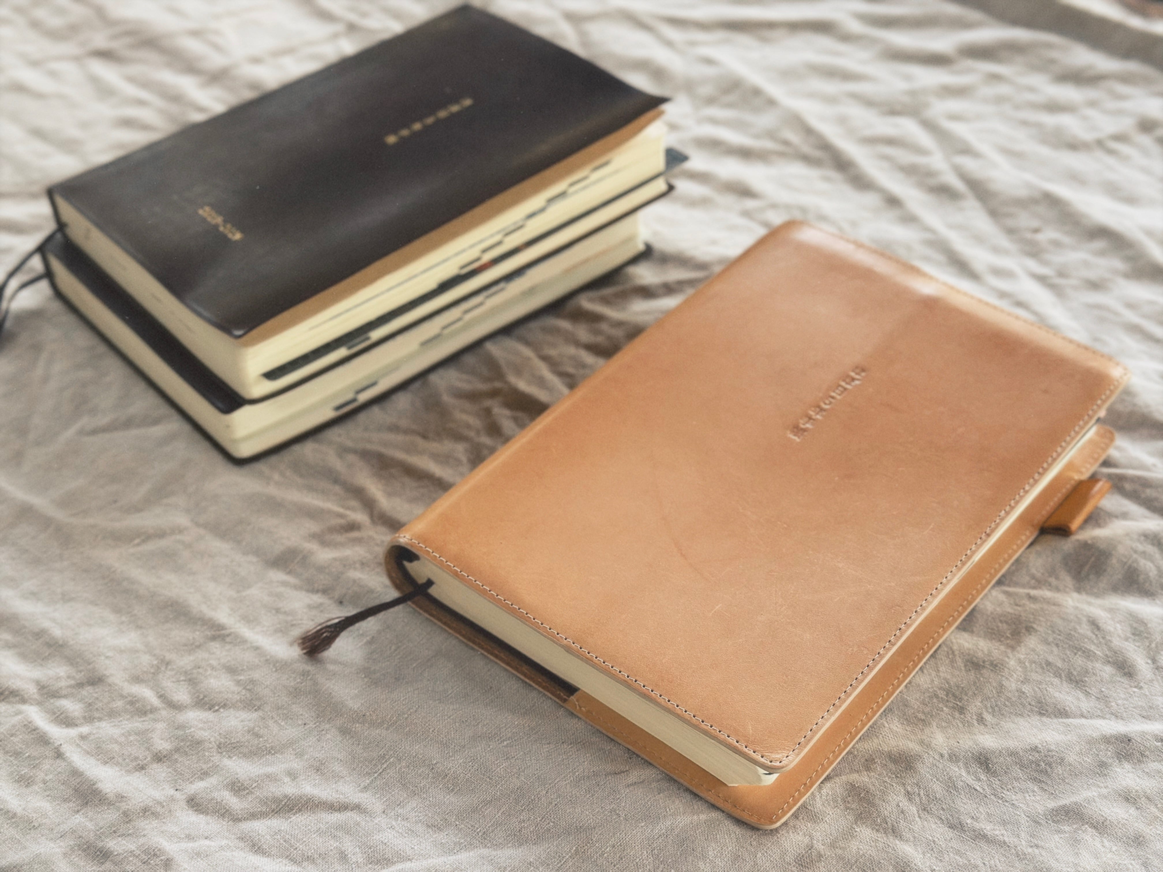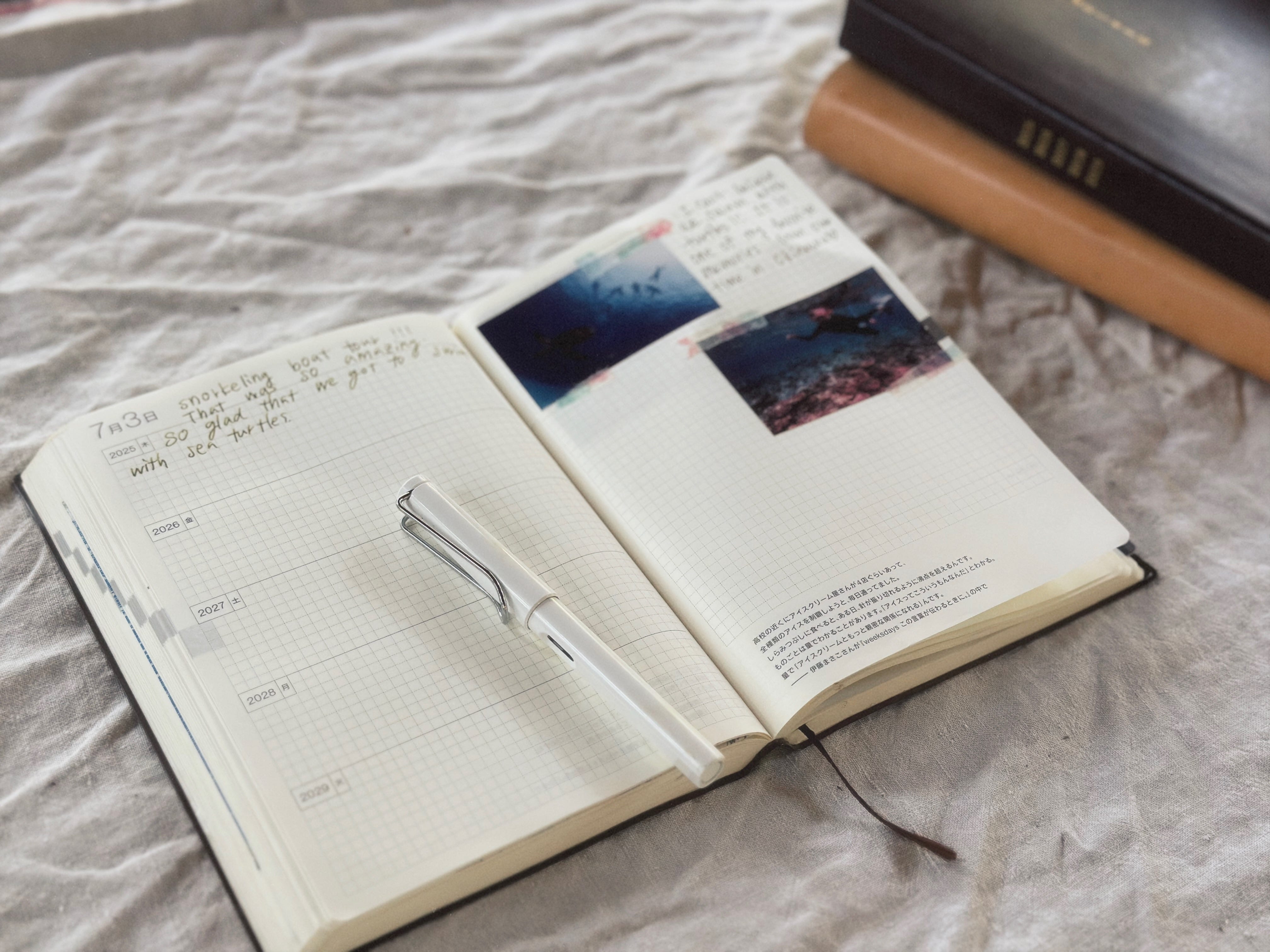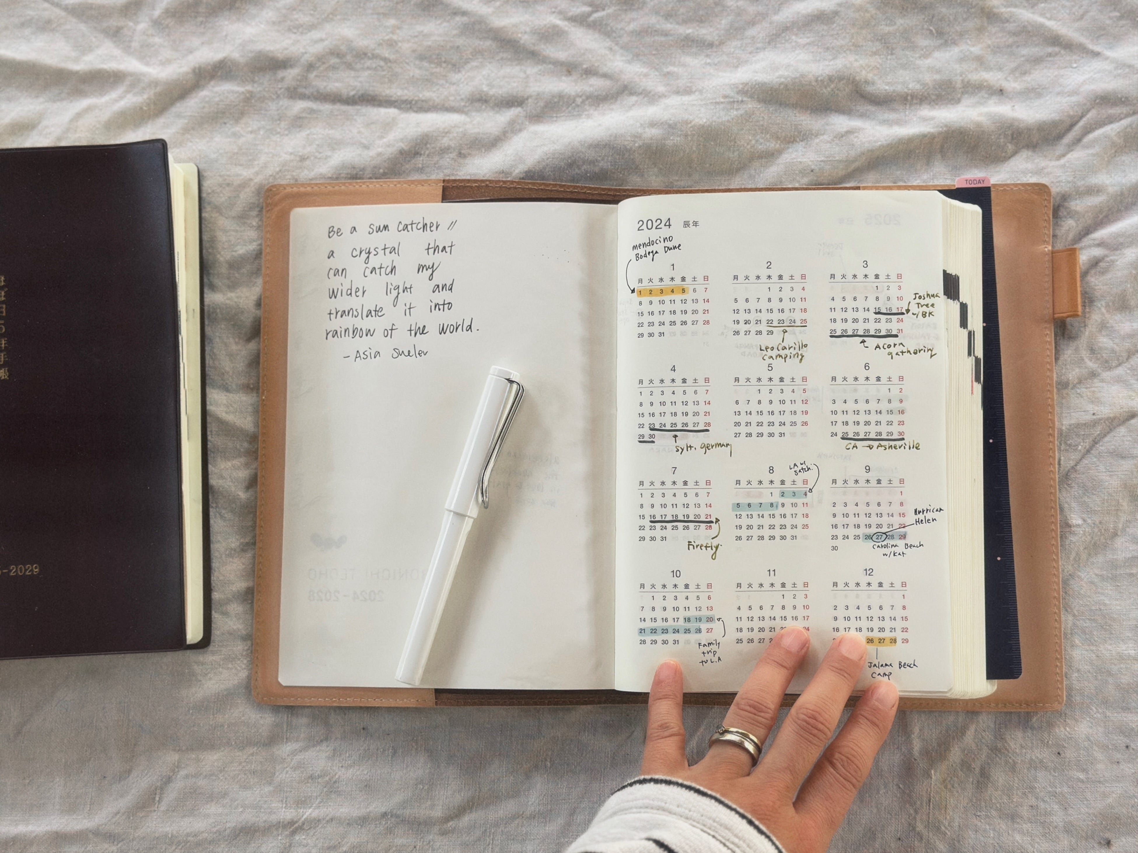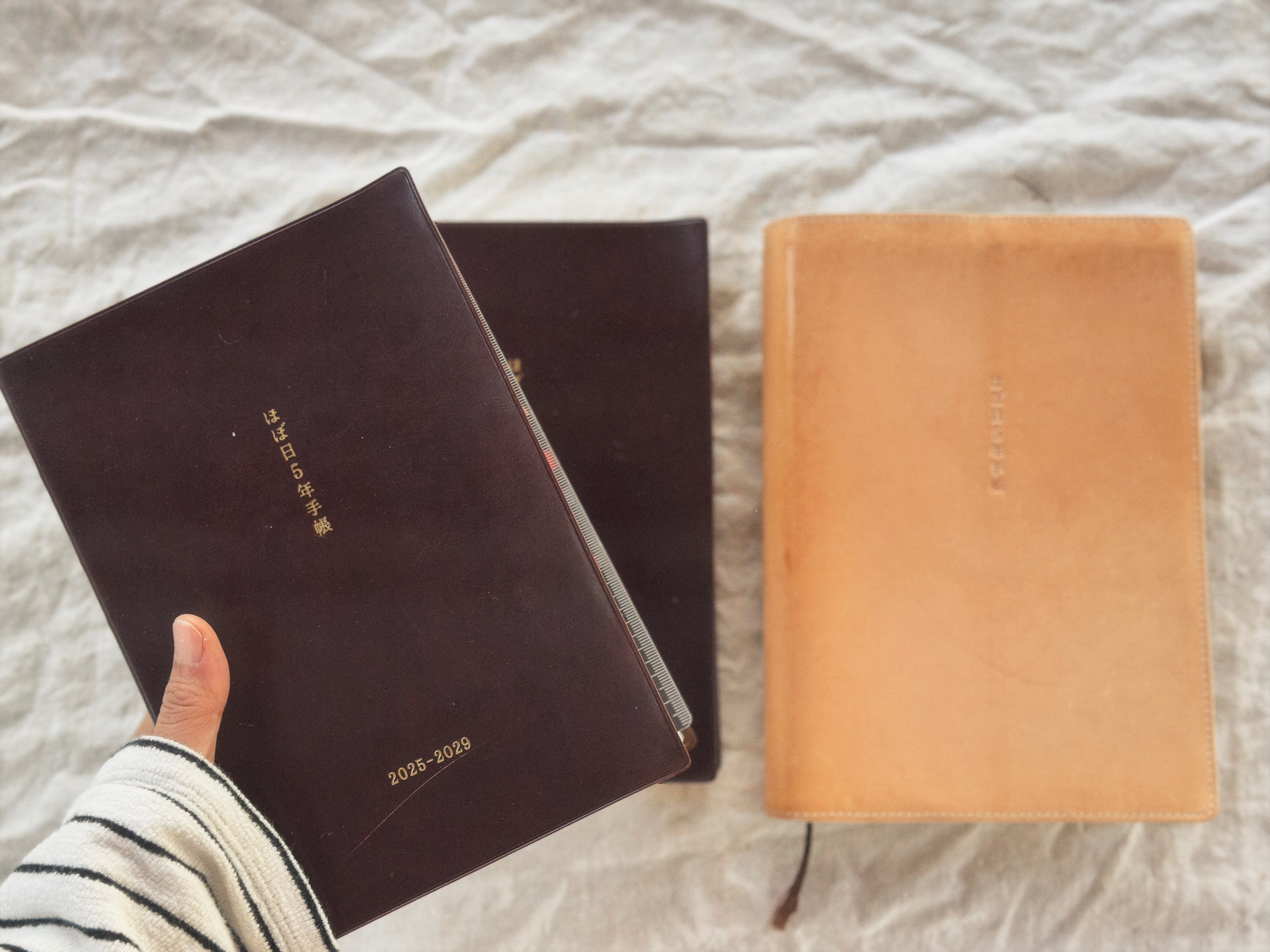 For my personal 5-year Techo, I am in year two of the current notebook, marking year seventeen (!!!) of keeping this kind of long-term journal. For the first 10 years, I used a slightly larger than A5-size 10-year journal from Manufactum, which I picked up also with a very light intention (or I should say with pure “intuition” at the time) while visiting our family in Hamburg. I was just about to turn 30. Since then, I have used A6-size 5-year Techo from Hobonichi, and then moved to A5 size for the last two years. Something shifted when I transitioned from an A6 to an A5-sized notebook with a leather cover. My daily entries used to be a quick summary of what I did on the day as a way to log our activities and external events. I still do that too, but when I flip through my past entries on the current notebook, my focus on writing has become more about an internal landscape, which I used to practice in a separate notebook. Instead of carrying yet another notebook, I consolidated them in my 5-year journal.
