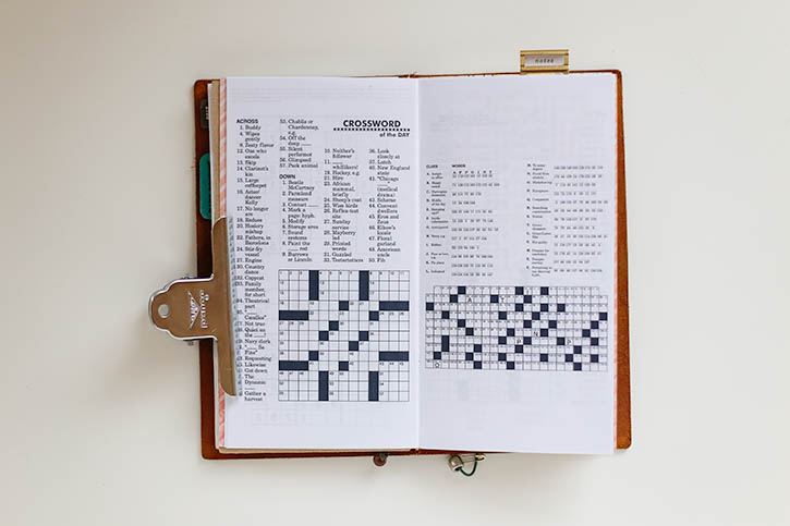 Some crossword puzzles slipped under an elastic, a zipper insert (from BK/Soft Goods 1.61) when I want my notebook to double as my wallet.