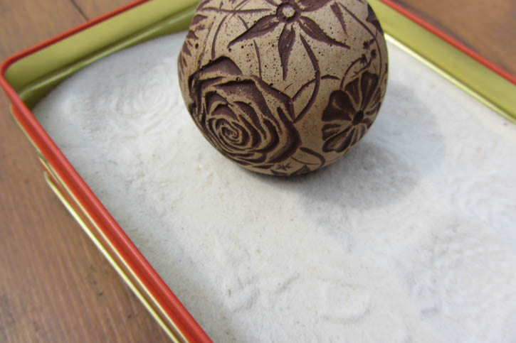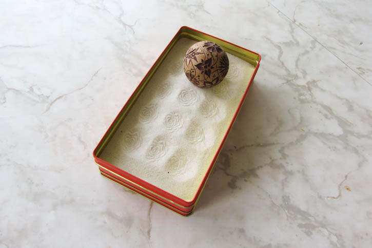 I appreciate that we can bring the beauty of nature even when space is really limited. I love what our friend Susan has done to create a miniature zen garden in her home with a little bit of white sand and a beautifully ornamental cement sphere.