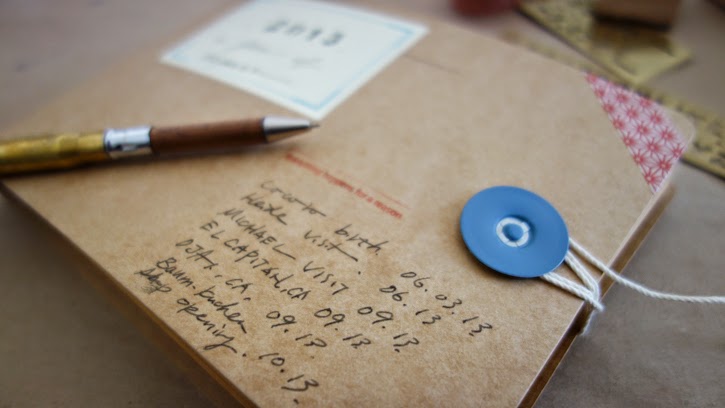 I like giving each page (an envelope with a window to be exact) a little theme. A page about welcoming Coco in our life (that was a big one in 2013...), our travel, a page about sisterhood, opening the shop... I write a few things around the window on each page to remember why certain artifacts made it to the page with a hope that our girls will someday look back and sense our life in a tangible way.