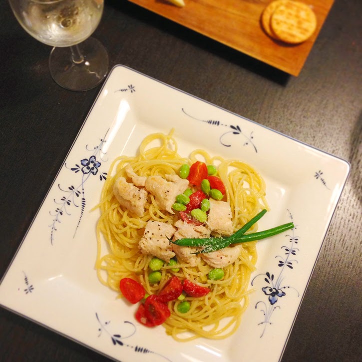 At home my husband prepped a little dinner giving homage to the day with "star" salad using sliced okura in star shape and Milky Way pasta with tomato and edamame best in season!