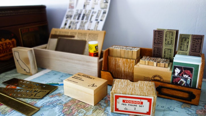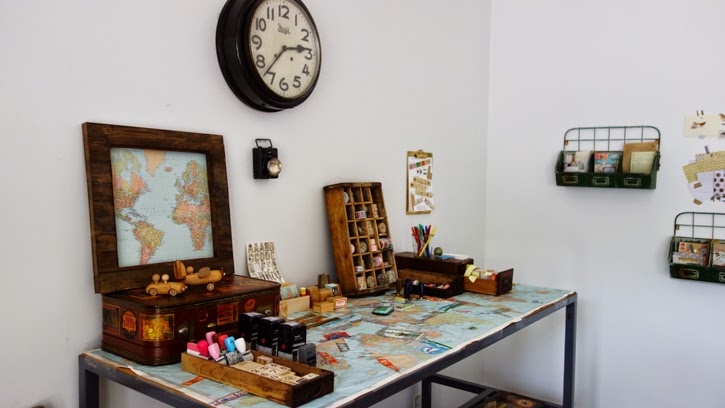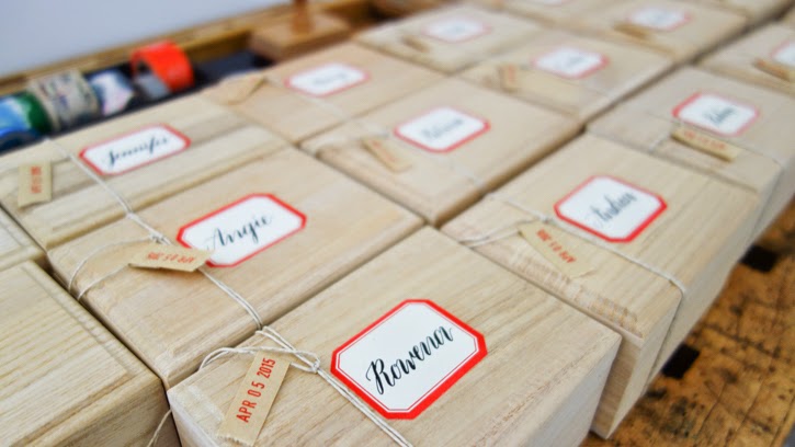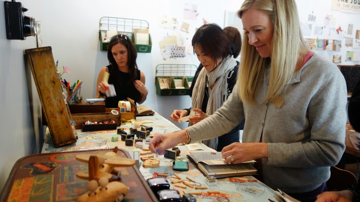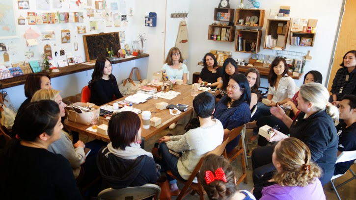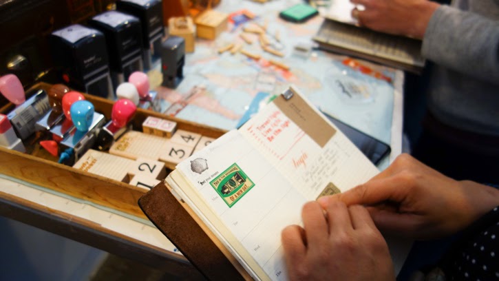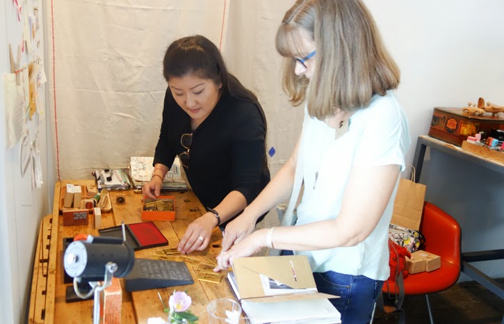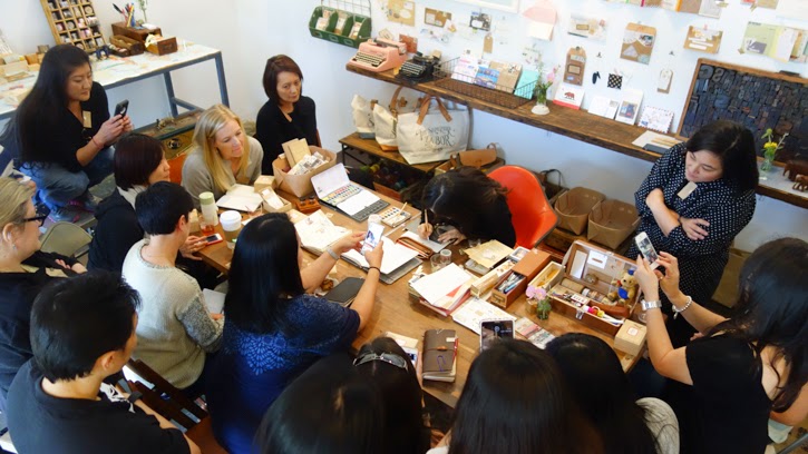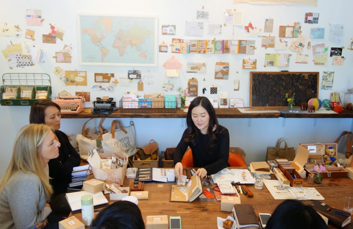 Eunice and I wanted to make sure that all the details in the Baum-kuchen studio space was well thought out and inspiring so we spent big chunk of the day before the workshop transforming the room. Our friend Angie and Eunice created the background wall filled with letters and correspondence from Eunice's penpals which provide lovely tone to an overall vibe in the room. We also put together multiple analogue tables especially curated by Euncie and Baum-kuchen so guests could "play" with their Traveler's Notebook and journals... making the Inspiration Lab truly a "lab environment" where everyone was experimenting with different analogue materials and tools to customize their notebooks. And of course... I had to make a Traveler's Notebook photo booth to celebrate the occasion. Yep. It's a photo booth especially made to take a picture of your TN. I am already dreaming more custom background and props for this photo booth;)