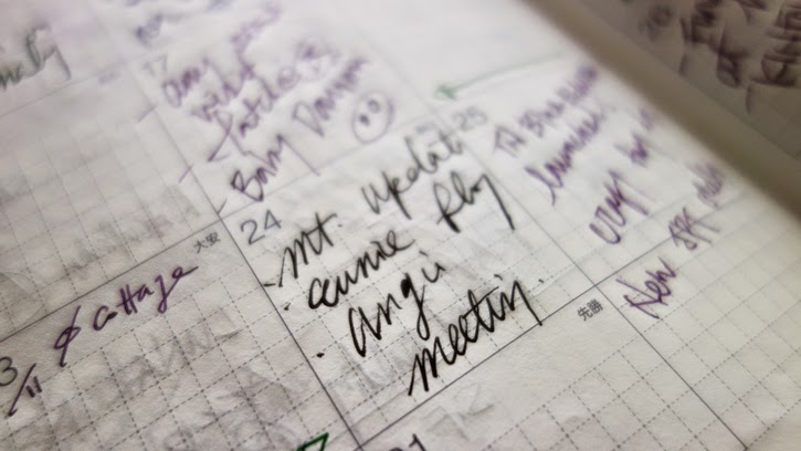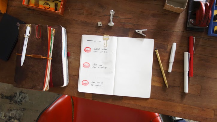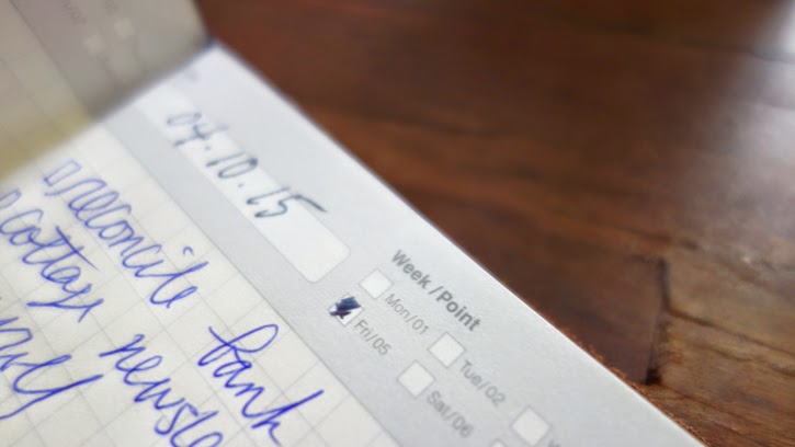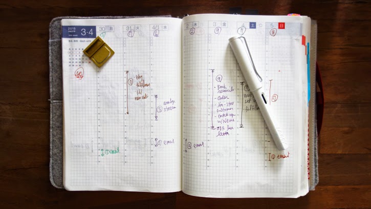 This is a new addition to my system which came from the need to have a simple open spread to write down 3 important things to accomplish the day or at the moment. I have been tinkering to be more mindful with my relationship with work as well as digital devices. Prior to having this notebook I sometimes found myself getting lost in the world of email, Instagram, Facebook... and everything else that happens virtually. A part of it is research and is okay... but between Baum-kuchen and family.... I needed to be conscious with my time. I noticed if I had a clear idea of what I really wanted/needed to accomplish at the moment, the more efficient and meaningful my time was spent. So I keep all my mental notes with my Bullet Journal on Traveler's Notebook and this A5 notebook which is slim enough to be clipped under the Roterfaden elastic band is my productivity zen place. I love spending few minutes to comb through my Bullet Journal at the beginning of the day, organize my thoughts and write down 3 things I want to tackle with my DARUMA stamp. I think we are all very busy and nobody really has enough time to get "everything" on the list done. But we could feel empowered and in control of our time by having a clear priority in life. It takes an on-going practice just as our muscle needs training but it has been a good journey for me.
