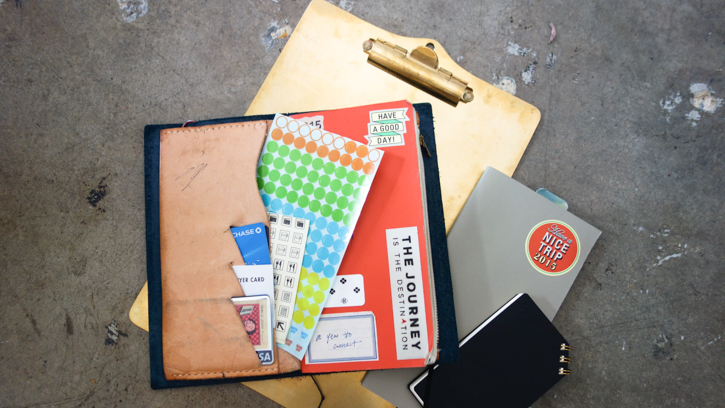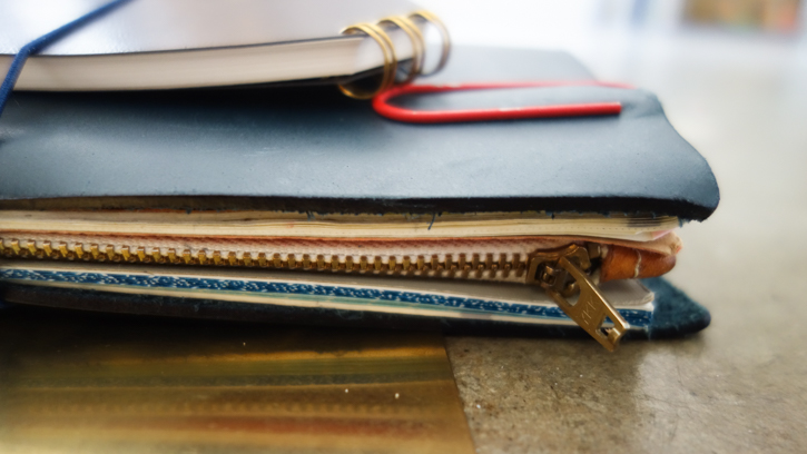My leather insert is getting nicely worn in after using it for over a year. Satchi and Coco left me some pen marks and I love all of that. This is my wallet component of my Traveler's Notebook. I carry a total of 7 cards I use most frequently in the card slots and few extra cards (like AAA card and a library card that don't need everyday access) in the zipper pouch. The front pocket holds receipts that need to be filed as well as few planner stickers. I have been carrying my Pilot Frixion erasable pen an Modern Fuel Mechanical Pencil in the zipper pouch. It helped me to streamline the TN leather cover.
