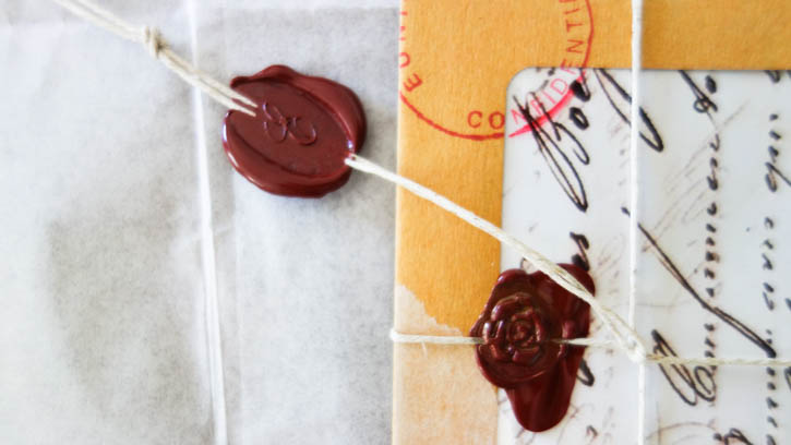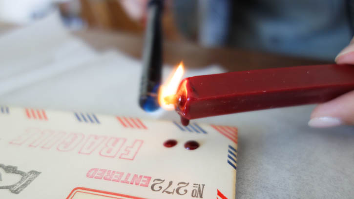 + Parchment paper is your best friend. It is not necessary but will make the job much easier. Have one small sheet of parchment paper to cover your “working area” where you will be doing the wax seal. The parchment paper will serve as a space where you can safely drop your wax stick as soon as you are done letting the wax drip onto your desired area.