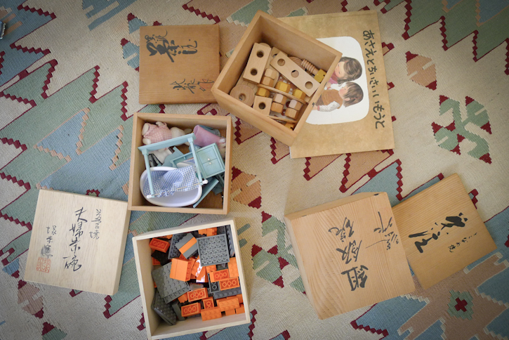 Some objects we have collected from travel... are still in a good shape and we enjoy discovering new ways of using them in our everyday life. These little wooden boxes we found in Japan are meant to be a packaging for artisan ceramic pieces. (I know... only in Japan... packaging looks as good as an object that is inside.) They are perfect fit to keep all the little toys Roo is starting to collect (from a doll house props to lego pieces). So here they are! It is a great alternative to plastic Tupperware;) It adds so much character to her room and nothing like the worn-in feeling for kids' room!