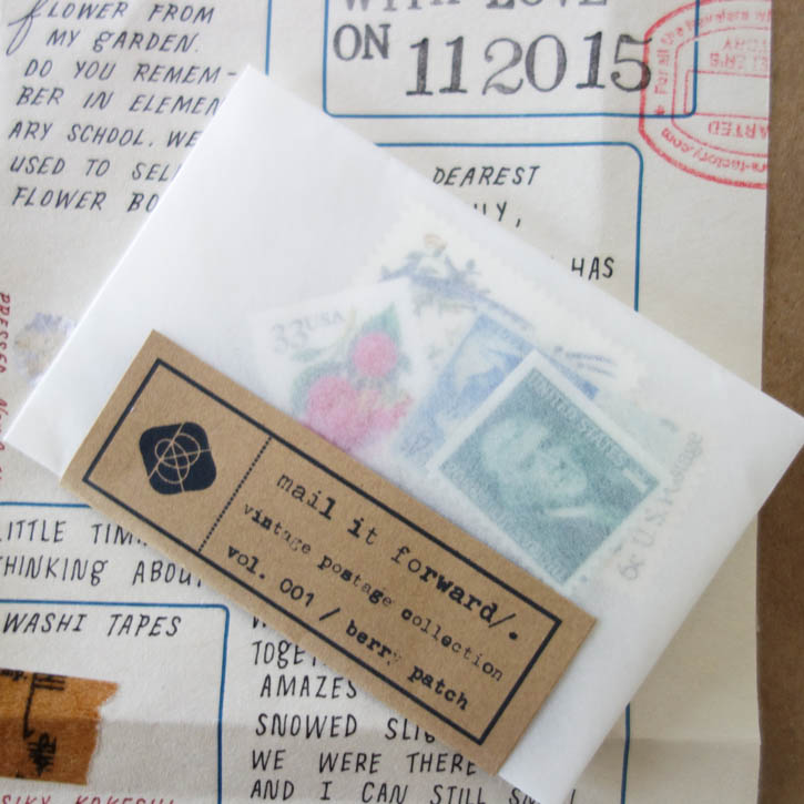 + If your pen pal shares little handmade goodies or paper goods (i.e. postage stamps, stickers, washi tape samples) try to send them something similar in return. (maybe include "Mail it Forward" vintage postage set?)