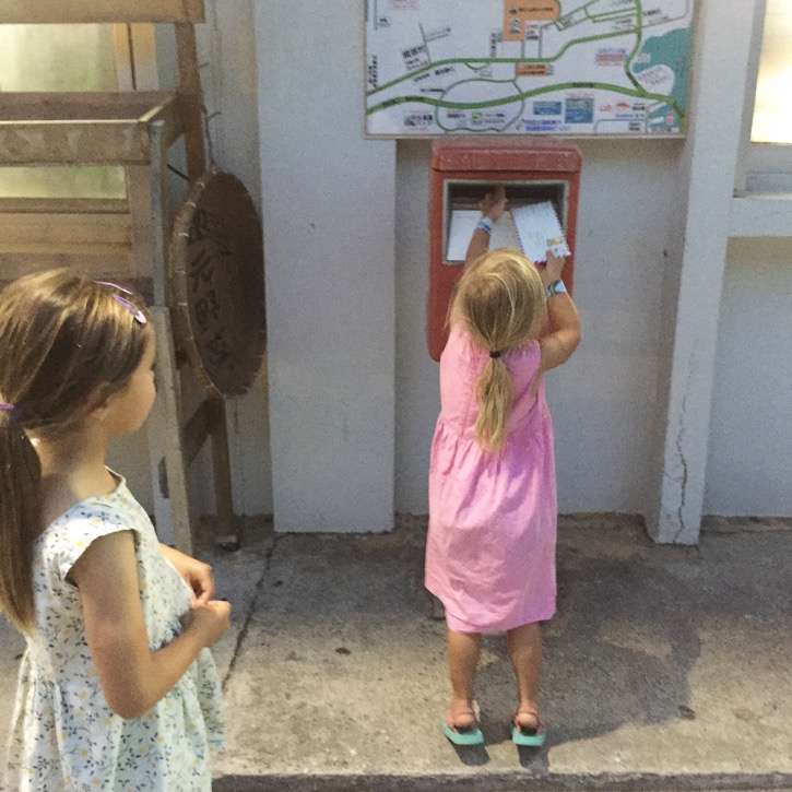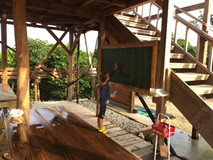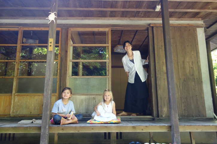 This was our first house we moved in. Whenever we travel internationally, we look for a place with lots of space to adjust our jet lag... and avoid accommodations that are too close to neighboring rooms (and houses). We like the idea that any of us could wake up at 3am and make some noises without constantly worrying about waking up the entire neighborhood! So this place was perfect. It had a good size communal area with a low table where we ate our meals, played and hang out and had 2 extra rooms with bunk beds. Girls slept in a bunk bed and we laid futon mattress in the living room area. This house had a lovely outdoor space with a 2 story deck, a climbing wall and picnic tables to spread our notebooks and postcards out! It rained 2 of the 6 days we stayed there and was so nice to have some elbow room to watch rain without feeling like we were all jammed in a small room!