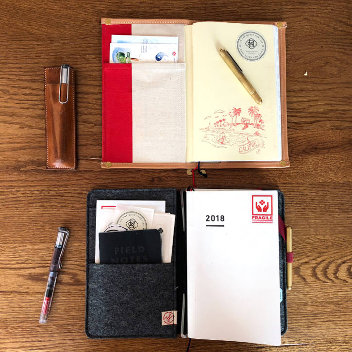 TSL Jibun Techo Cover is more minimalistic in what it does. We designed the cover so it can accommodate one Jibun Techo with 2 additional notebooks. I currently carry Jibun Techo Biz, clear zipper case, and additional Idea Notebook. I have a few postcards in the front pocket and a few BK shop card in the back card pocket and just transformed my wallet into the clear zipper case. I wanted to keep my setup as slim as possible so it doesn't become a burden to carry it every day and so far it has been working out. I have a few of my favorite fountain pens in the Pen Holder Clip and I am ready to go.