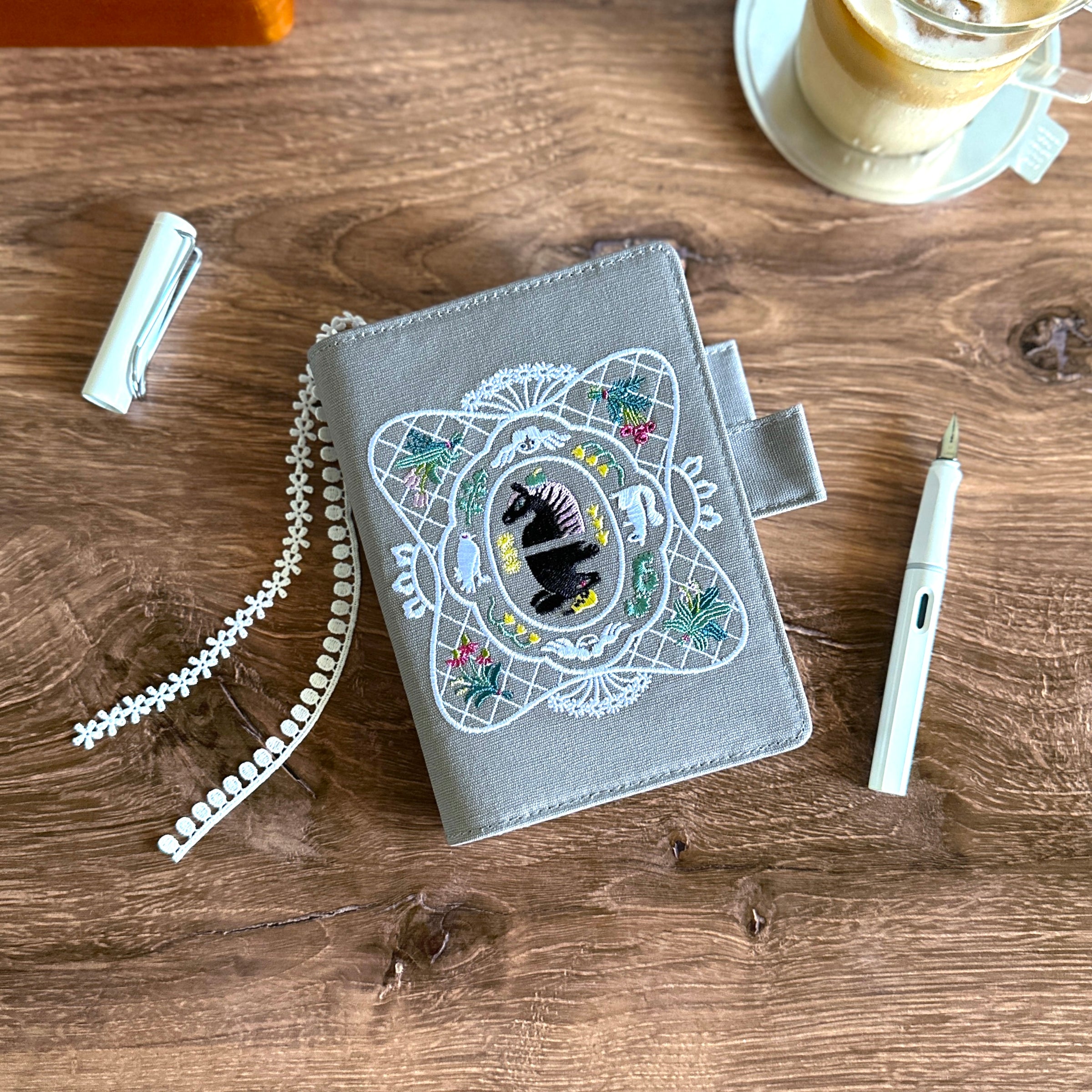 Keep your year delightfully organized with this Hobonichi Original Planner and cover set! The cover’s exterior features charming embroidery by artist and illustrator Iyo Okumi. The vignette is threaded with grounding motifs from daily life such as animals and plants framed with a white lace border. The interior has card slots with additional vertical pockets to keep ephemera or lifestyle artifacts secure and organized. Attached are two ribbon page markers that help you get to the current pages you are working on effortlessly. The two pen loops hold your favorite pen and act as a closure when a pen is inserted so that your pages are secure when you are on the go!