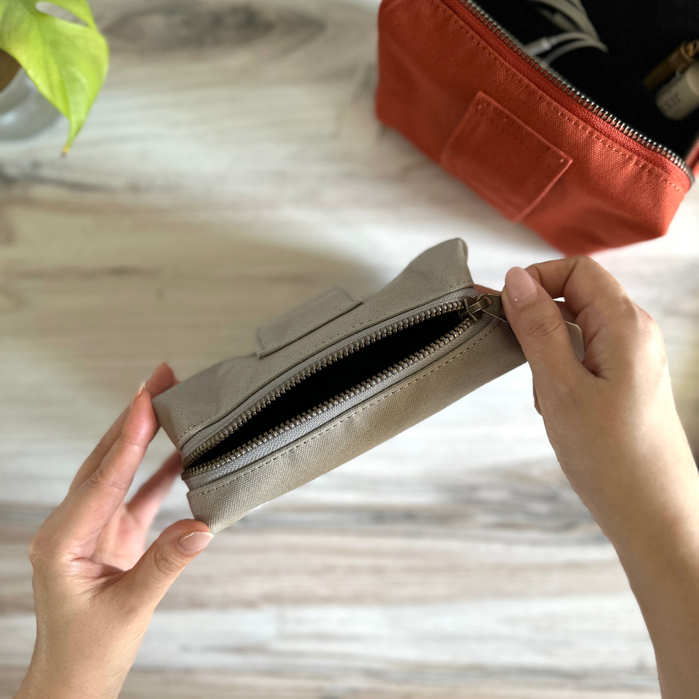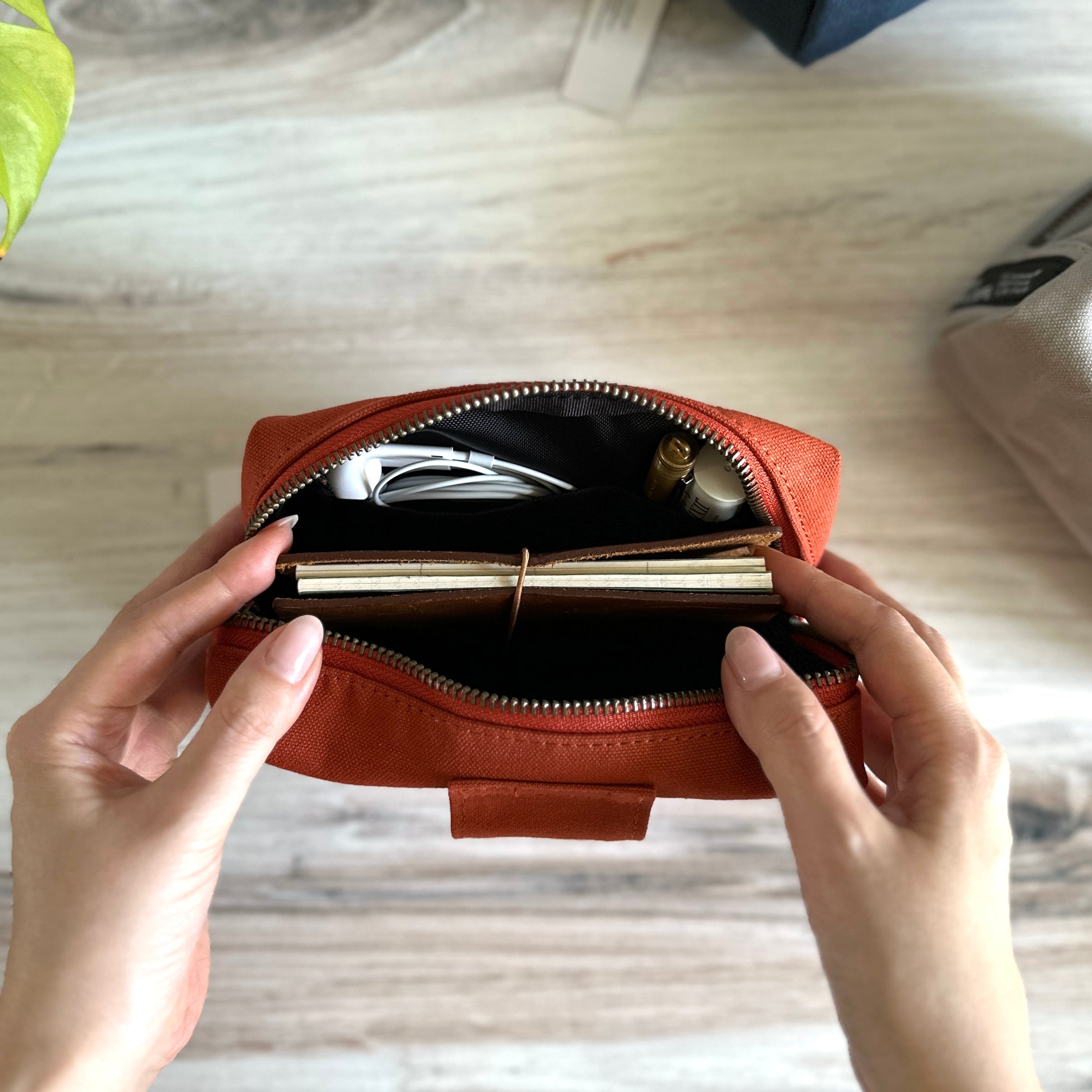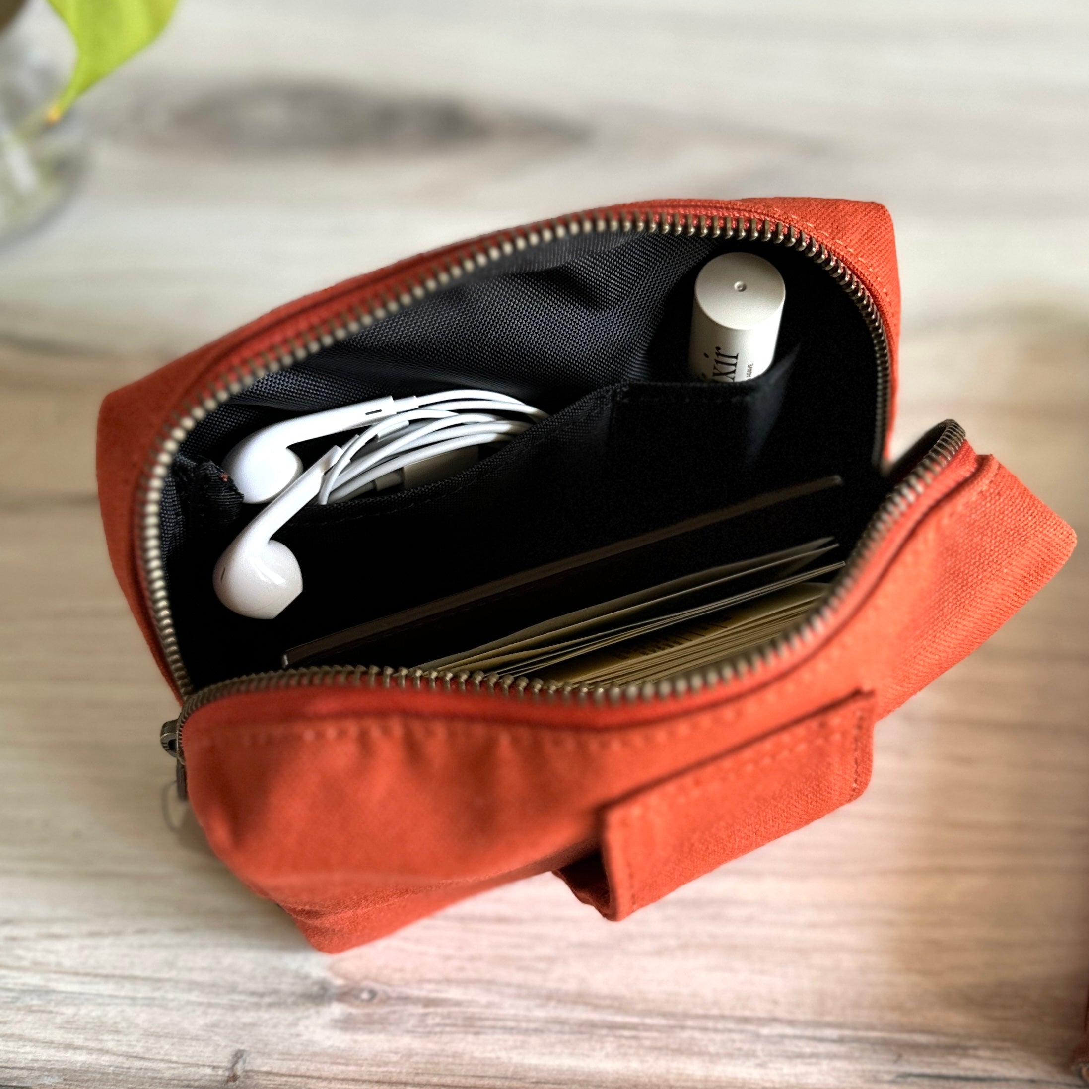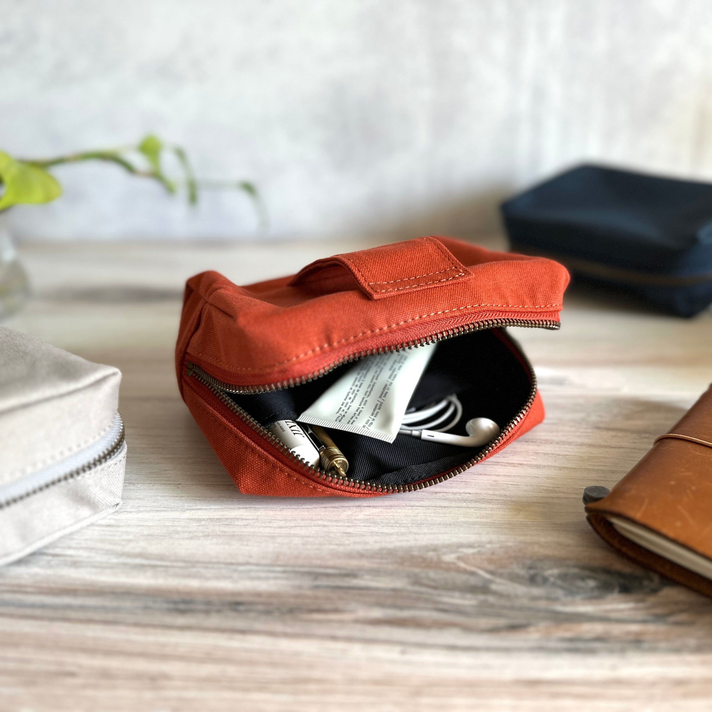 We love this versatile and adorably plump pouch, designed with a clever back loop that lets you slip your hand, belt, or even a shoulder strap through for easy carrying. The interior is lined with Teflon-coated nylon Oxford fabric, making it water-repellent and ready to protect your essentials. Its roomy yet compact shape along with small organizational pockets inside is perfect for holding analogue tools, small tech accessories, or daily necessities. It’s a pouch that is ready for both your desk and your next big/small adventure!