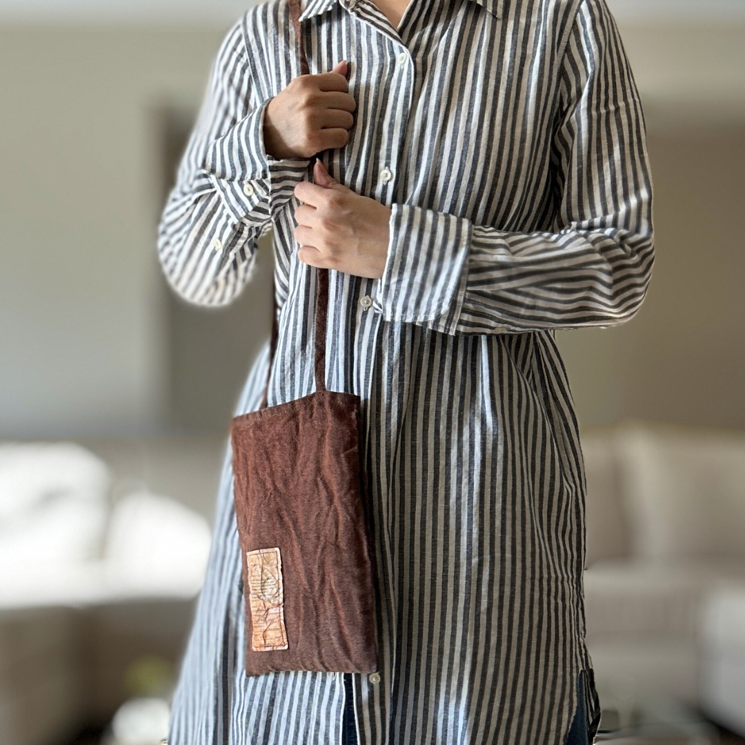 A beautifully minimal bag at first glance, with a little secret tucked inside. Inspired by the simple structure and cozy comfort of a clothing pocket, a discreet seam along the side reveals a hidden pocket. This little nook is perfect for smaller artifacts such as pens or keys, or even a resting hand. The overall slender silhouette comfortably holds a Traveler’s Notebook Regular, your phone, and a few daily essentials. Enjoy being hands free while you explore the world around you with an extra little pocket to hold only what you need!