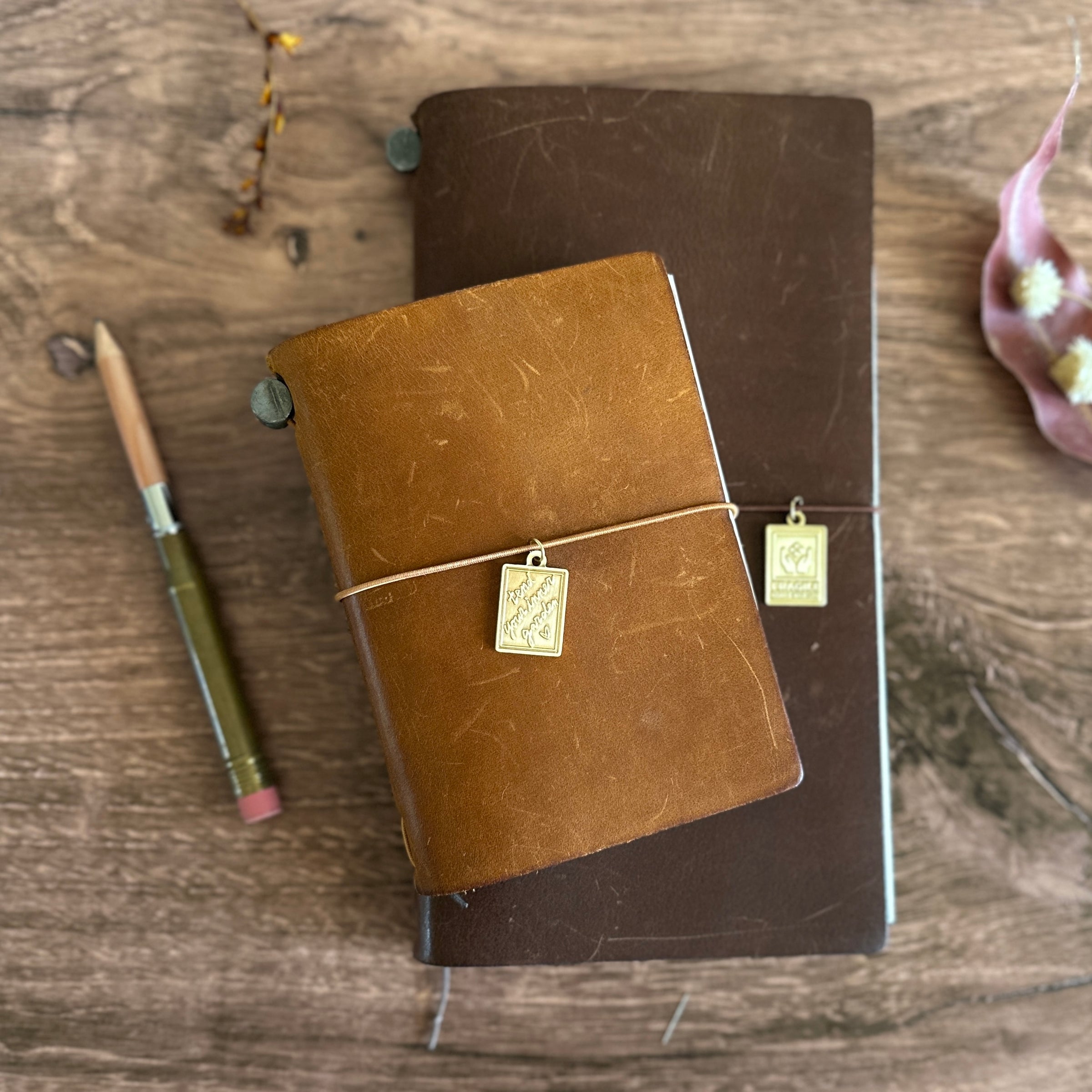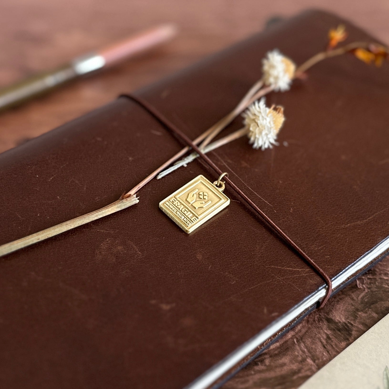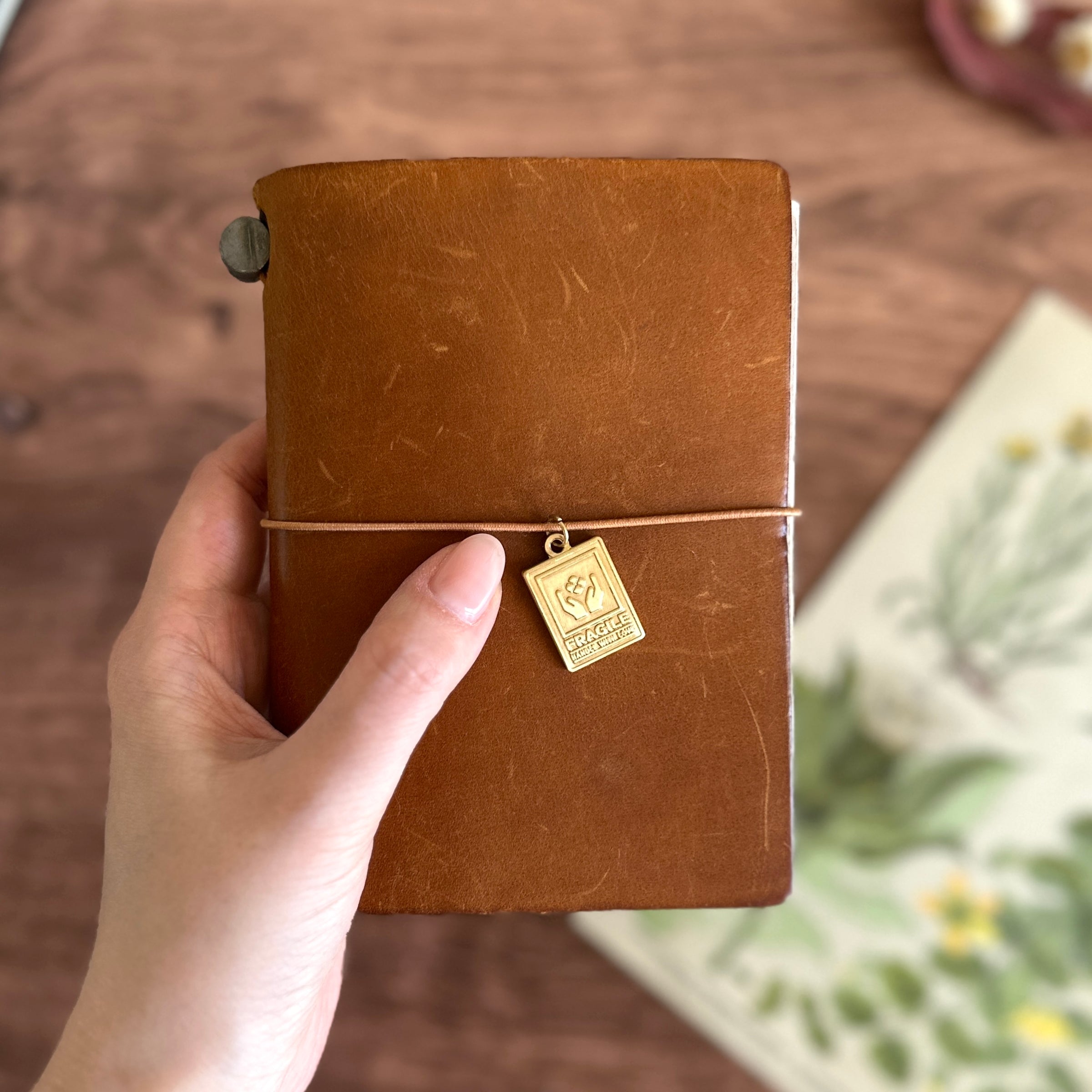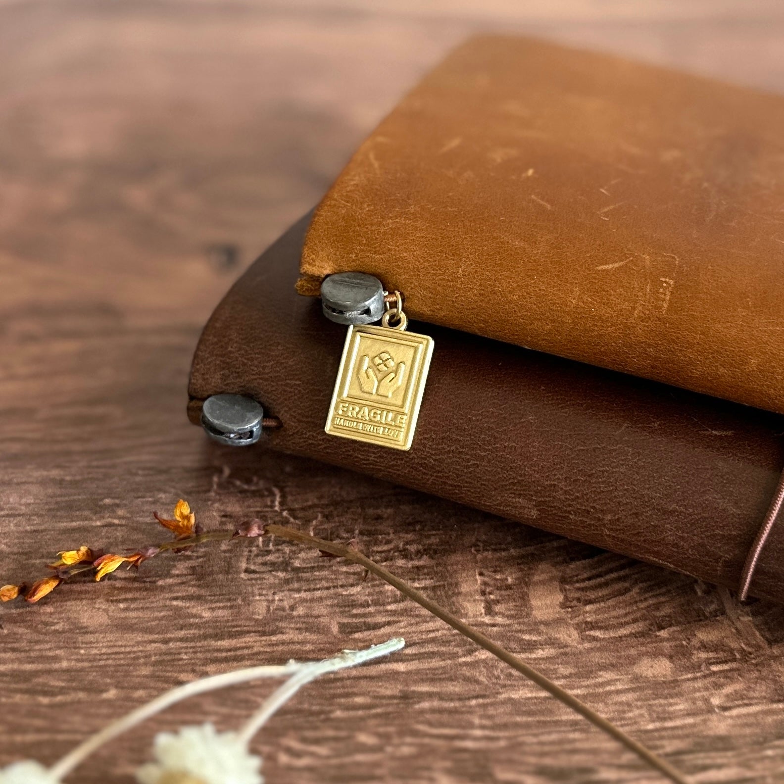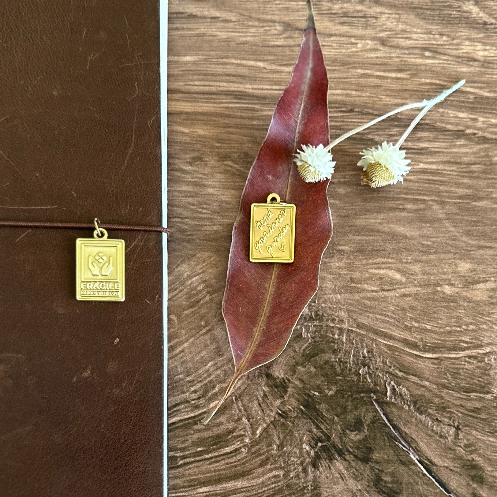 Each brass charm is pressed with the "Fragile // Handle with Love" quote on the front and a handwritten phrase, "tend your inner garden," on the back. The charm can be easily attached to your Traveler's Notebook's elastic band. The brass will darken and patina over time with usage.