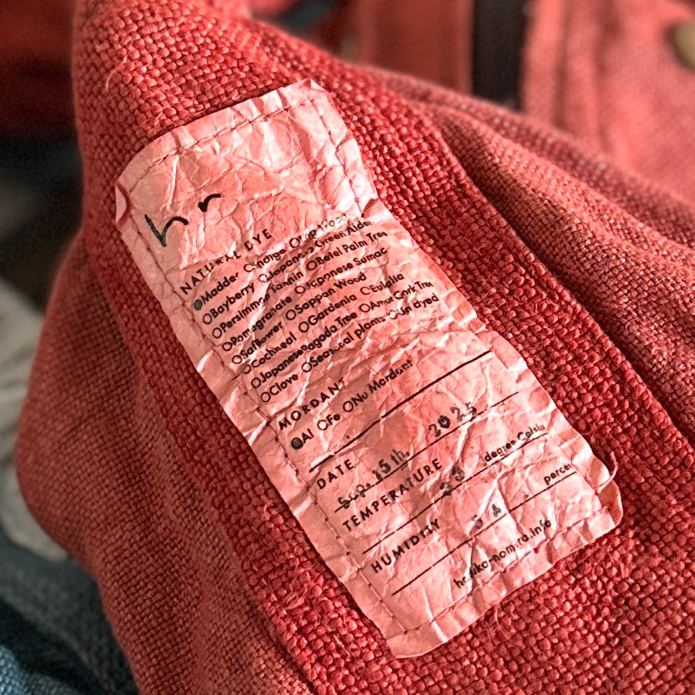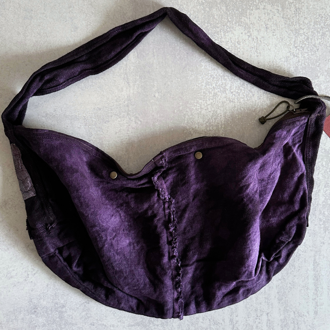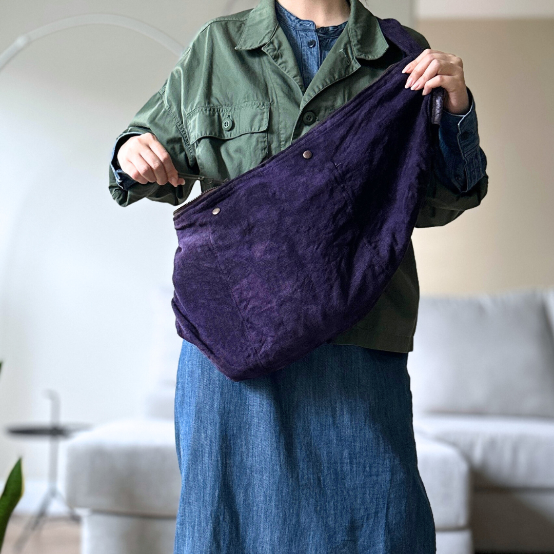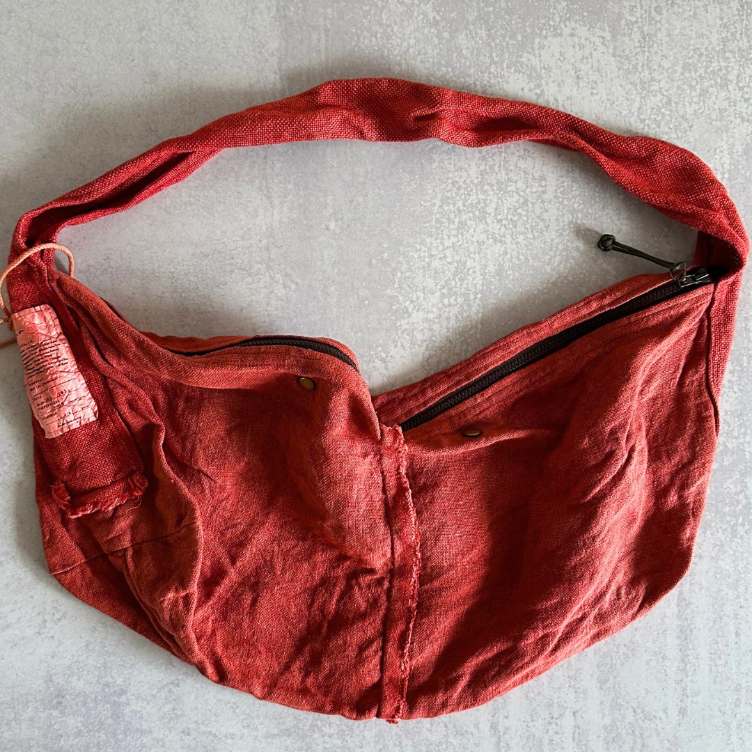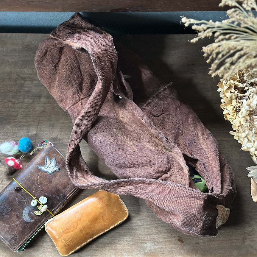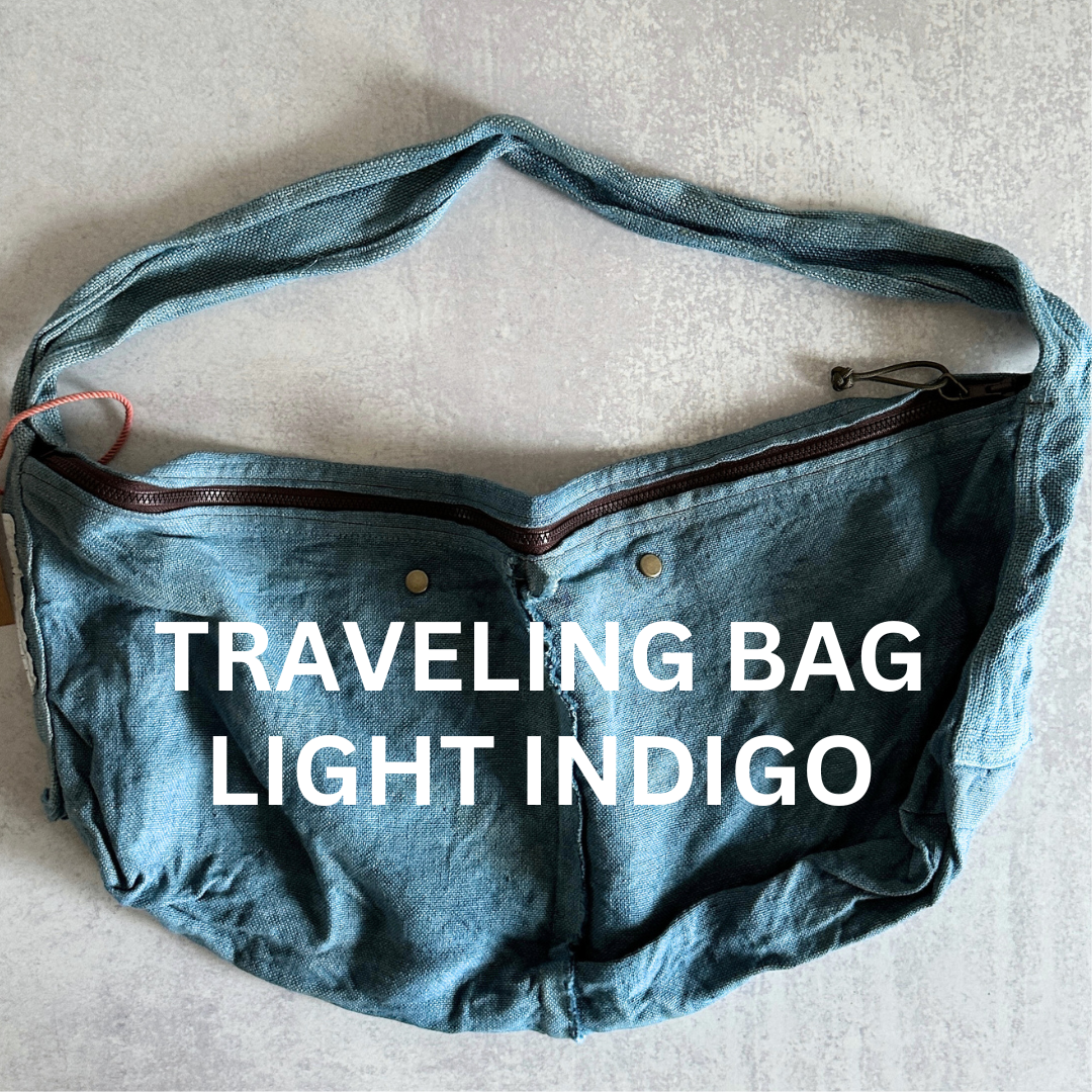 Haru Nomura’s first bag design, the Traveling Bag, was born from her love of wandering and the quiet freedom of exploring on her bicycle. Crafted from lightweight linen, it feels airy and effortless as a feather, an ideal companion for both your adventures near and far. Organize smaller items in the inner pocket and zip it to keep everything secure. A special tag is sewn on every piece, recording the date, temperature, humidity, and plant dye used, celebrating the exact moment in time when it was made. The variations in color and texture reflect the uniqueness of every bag. As you carry it through daily life and new adventures, we hope you’ll enjoy watching it soften, age, and develop its own patina alongside you!