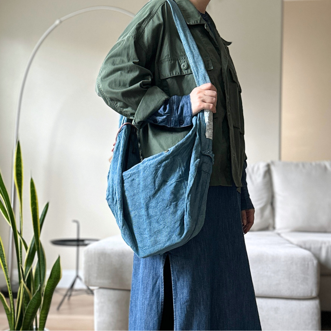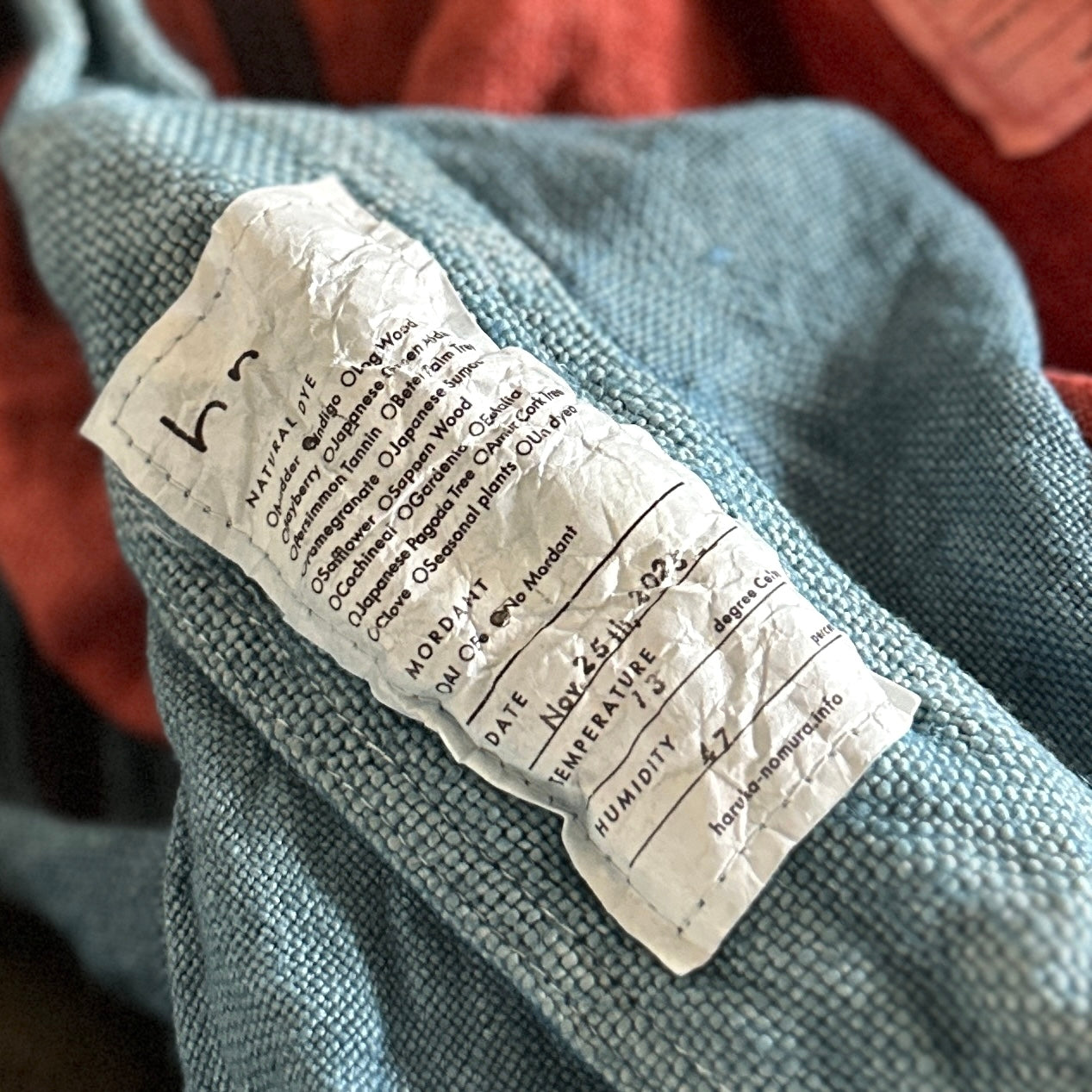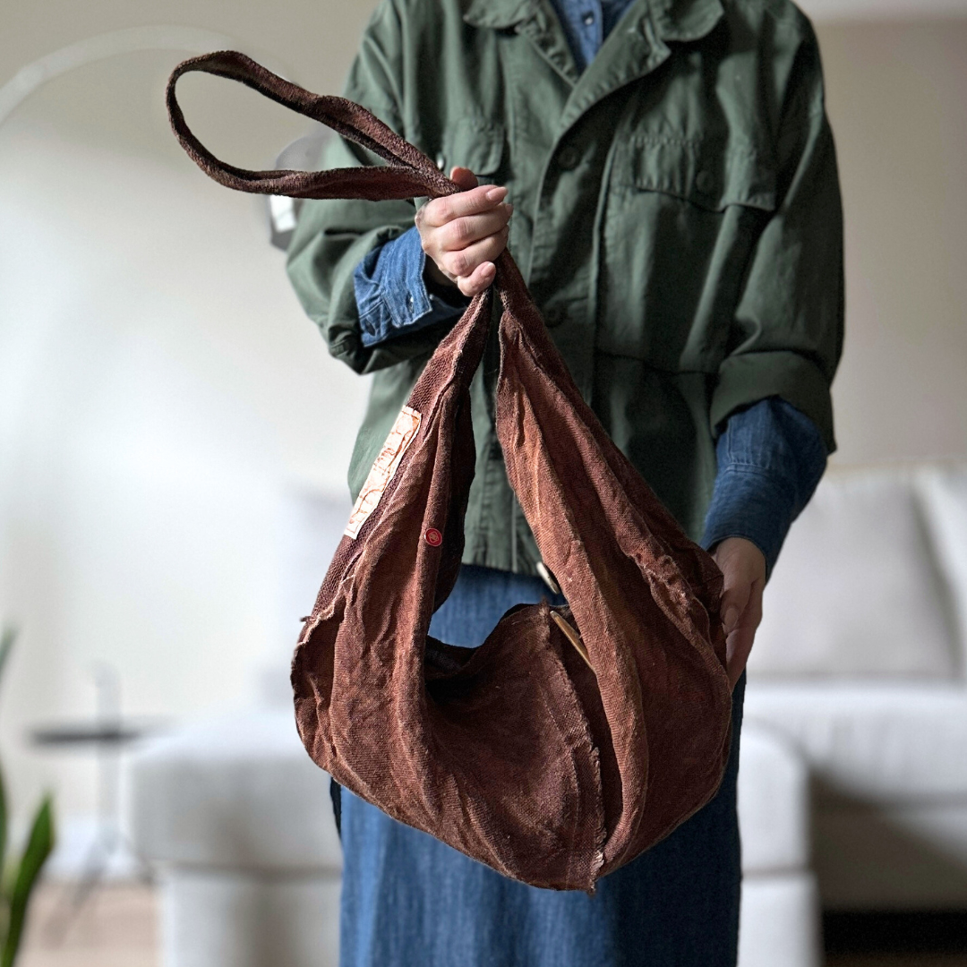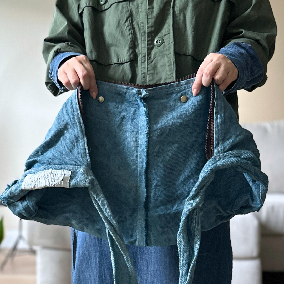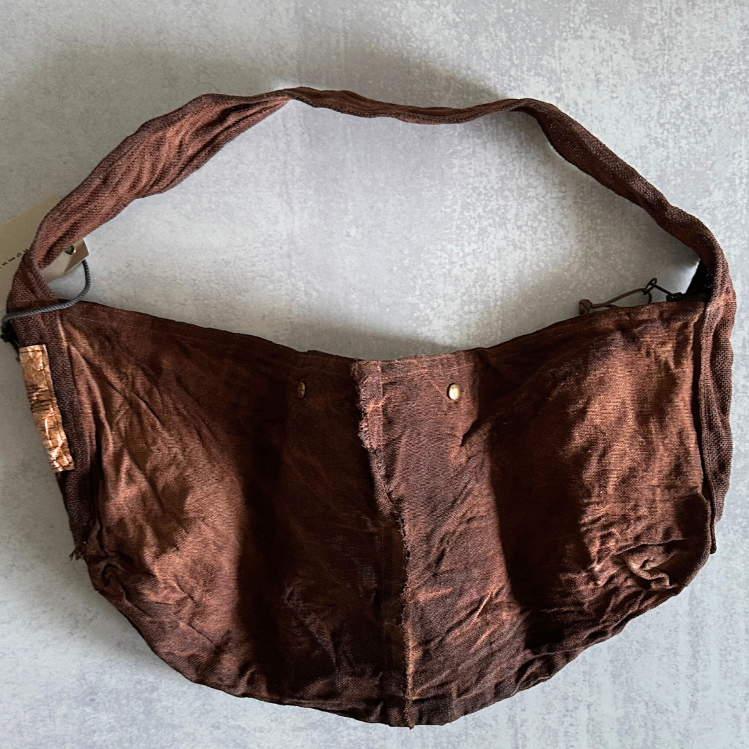 Haru Nomura’s first bag design, the Traveling Bag, was born from her love of wandering and the quiet freedom of exploring on her bicycle. Crafted from lightweight linen, it feels airy and effortless as a feather, an ideal companion for both your adventures near and far. Organize smaller items in the inner pocket and zip it to keep everything secure. A special tag is sewn on every piece, recording the date, temperature, humidity, and plant dye used, celebrating the exact moment in time when it was made. The variations in color and texture reflect the uniqueness of every bag. As you carry it through daily life and new adventures, we hope you’ll enjoy watching it soften, age, and develop its own patina alongside you!