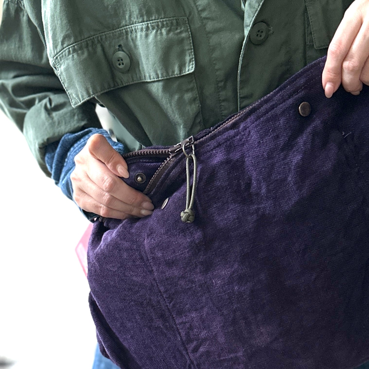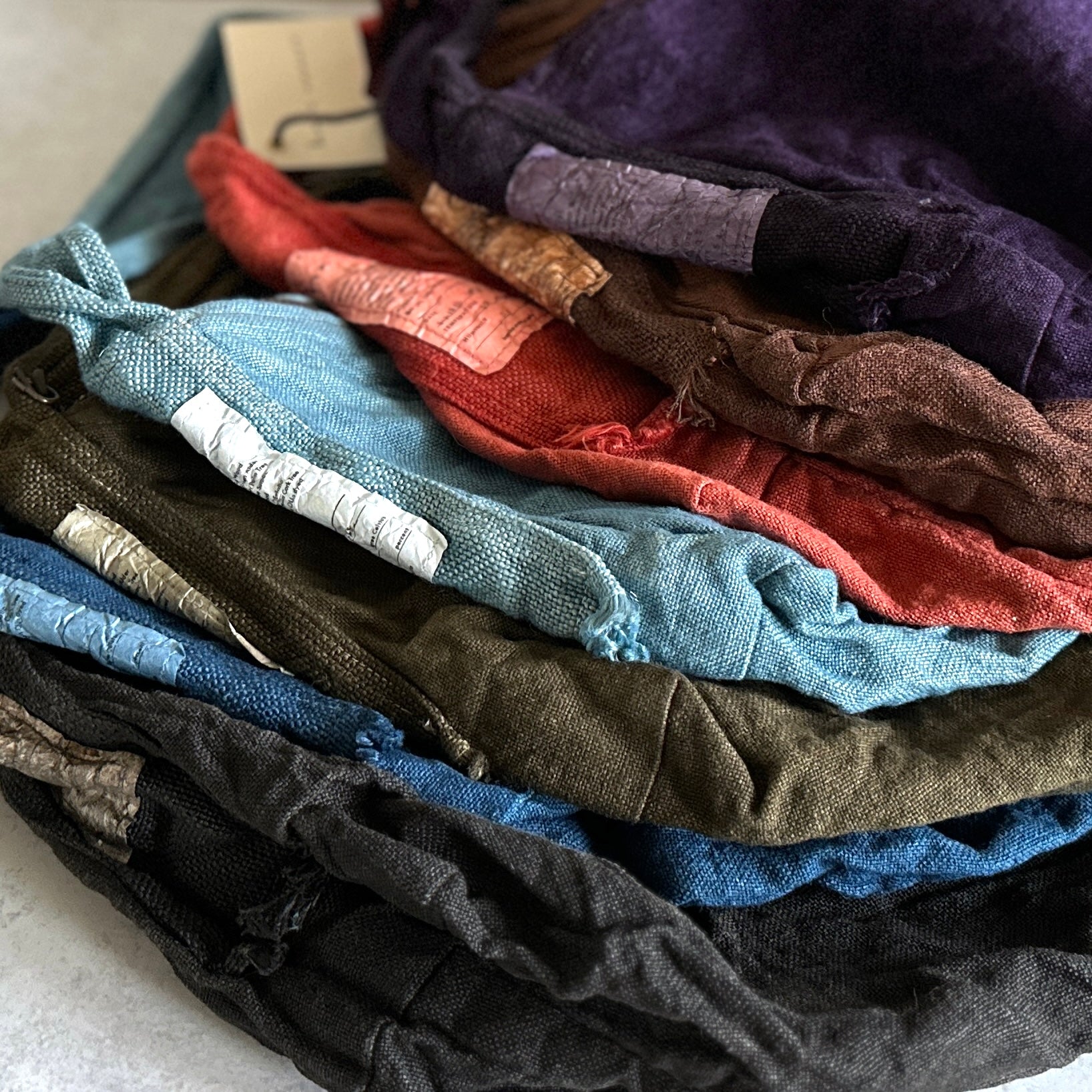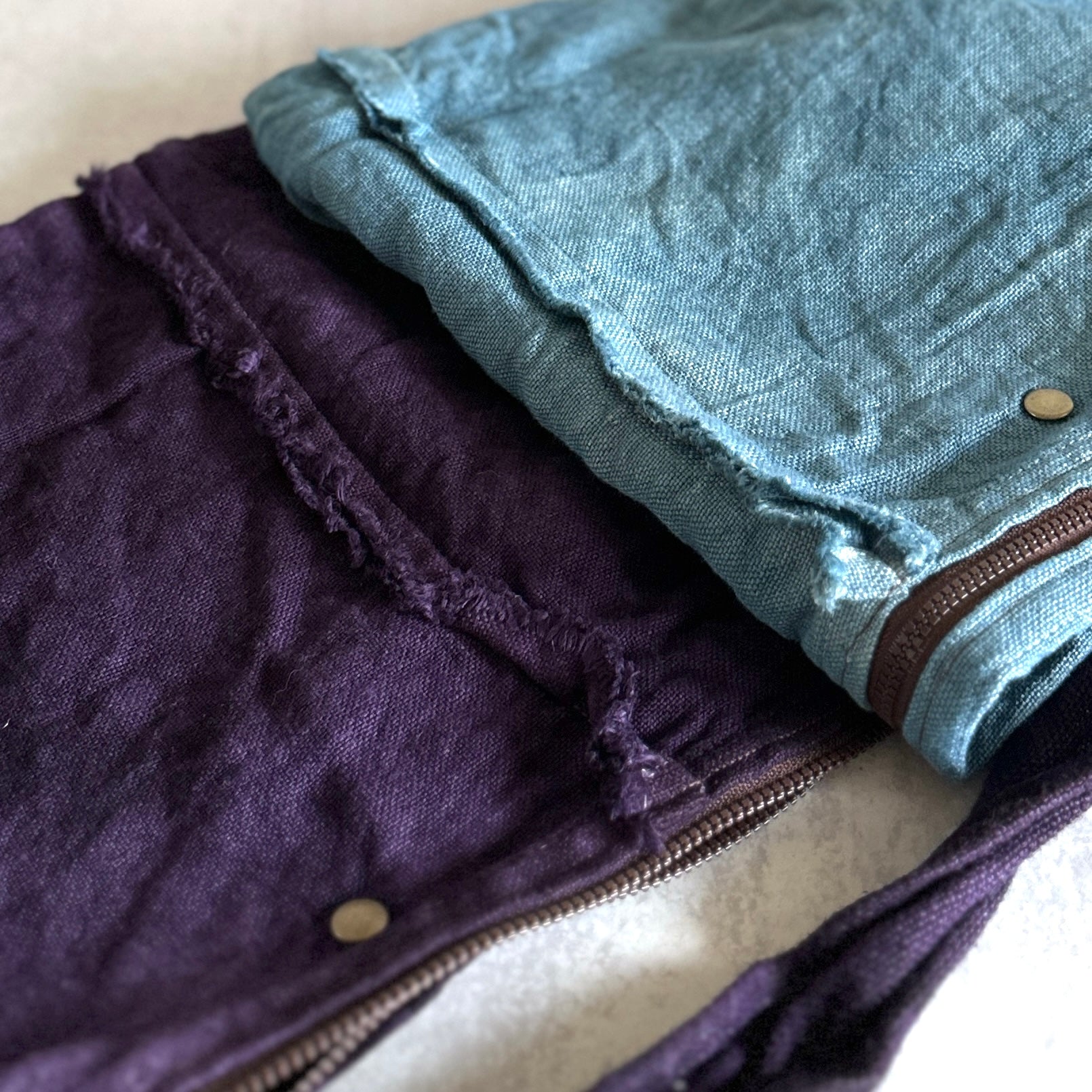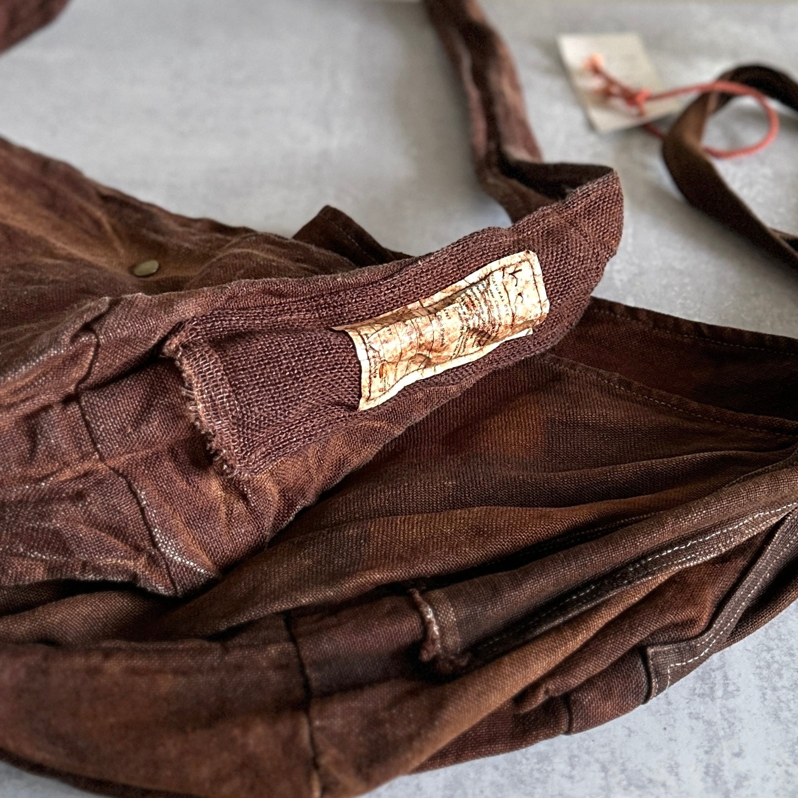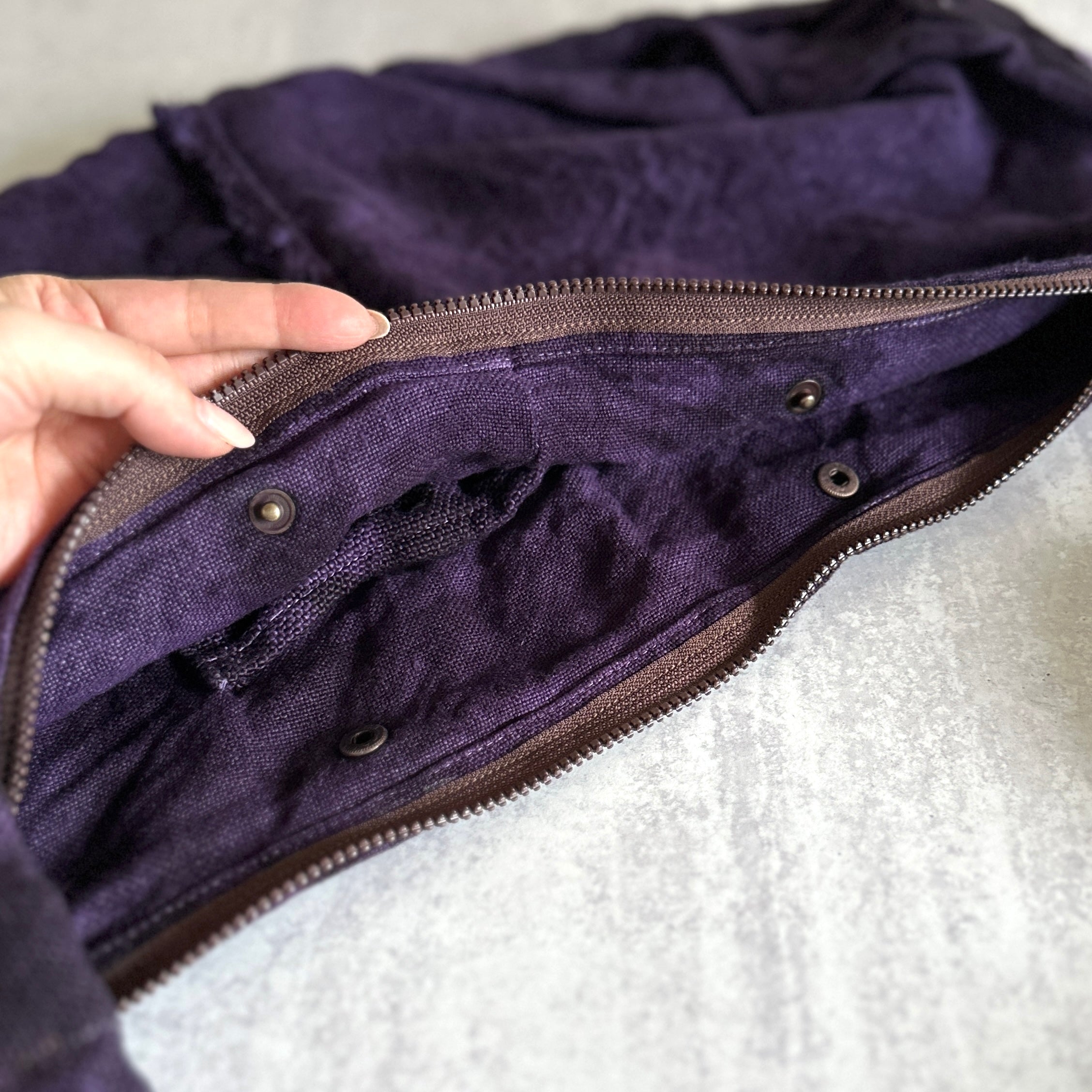 Haru Nomura’s first bag design, the Traveling Bag, was born from her love of wandering and the quiet freedom of exploring on her bicycle. Crafted from lightweight linen, it feels airy and effortless as a feather, an ideal companion for both your adventures near and far. Organize smaller items in the inner pocket and zip it to keep everything secure. A special tag is sewn on every piece, recording the date, temperature, humidity, and plant dye used, celebrating the exact moment in time when it was made. The variations in color and texture reflect the uniqueness of every bag. As you carry it through daily life and new adventures, we hope you’ll enjoy watching it soften, age, and develop its own patina alongside you!