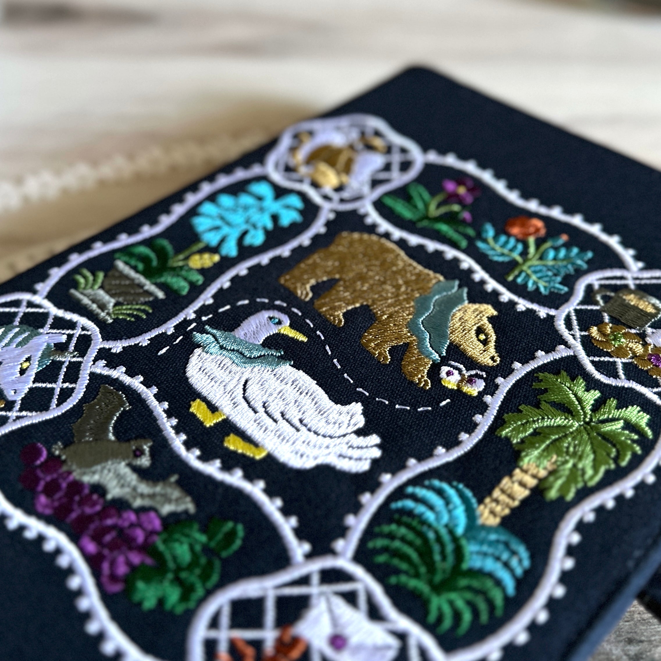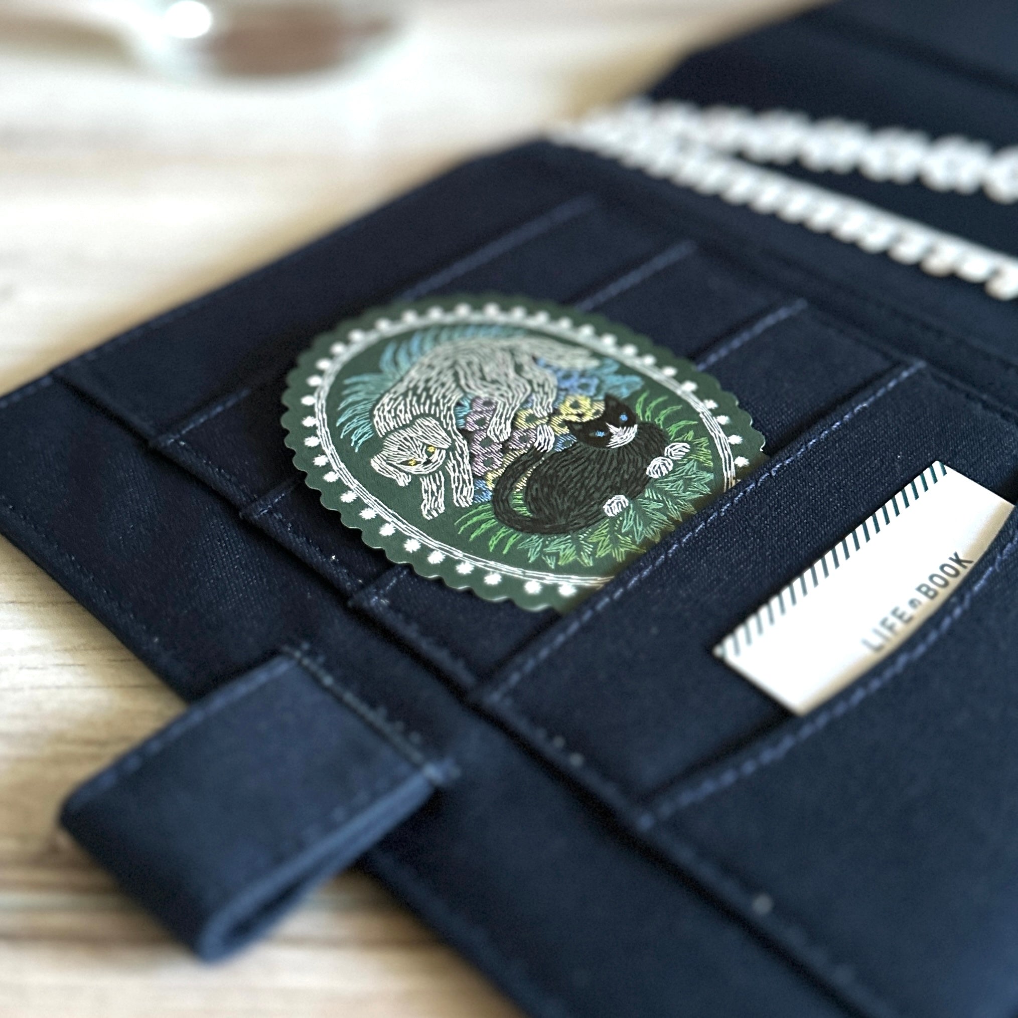 Keep your year delightfully organized with this Hobonichi Cousin A5 Planner and cover set! The cover’s exterior features charming embroidery by artist and illustrator Iyo Okumi. The vignette is threaded with grounding motifs from daily life such as animals and plants framed with a white lace border. The interior has card slots with additional vertical pockets to keep ephemera or lifestyle artifacts secure and organized. Attached are two ribbon page markers that help you get to the current pages you are working on effortlessly. The two pen loops hold your favorite pen and act as a closure when a pen is inserted so that your pages are secure when you are on the go!