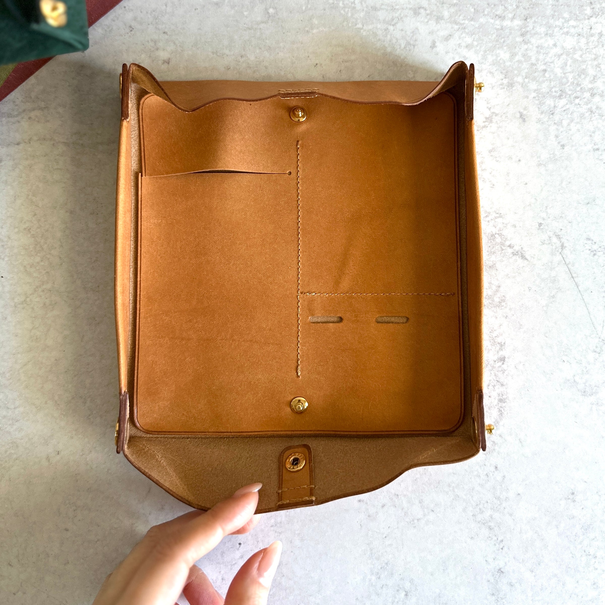 The Dritto Pen Case is a beautifully crafted, minimalist artifact that combines both form and function. This innovative pen case transforms into a tray when unrolled, offering the convenience of having all your tools available at a glance. The origami-inspired fold allows the pen case to securely hold everything in place, preventing the usual shifting about of your writing utensils that you might find in traditional designs. The large size builds on the classic pen roll with additional space and leather compartments to thoughtfully organize your analogue odds and ends, keeping treasured artifacts neatly separated. Enjoy this amazing artifact in any environment whether it be from your home, work, and travels. Simply roll it up, and go!