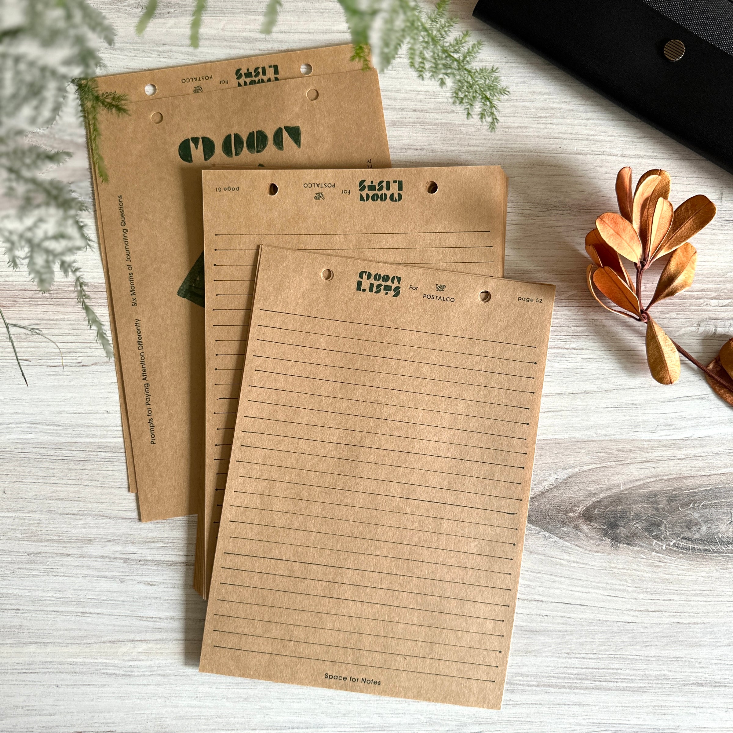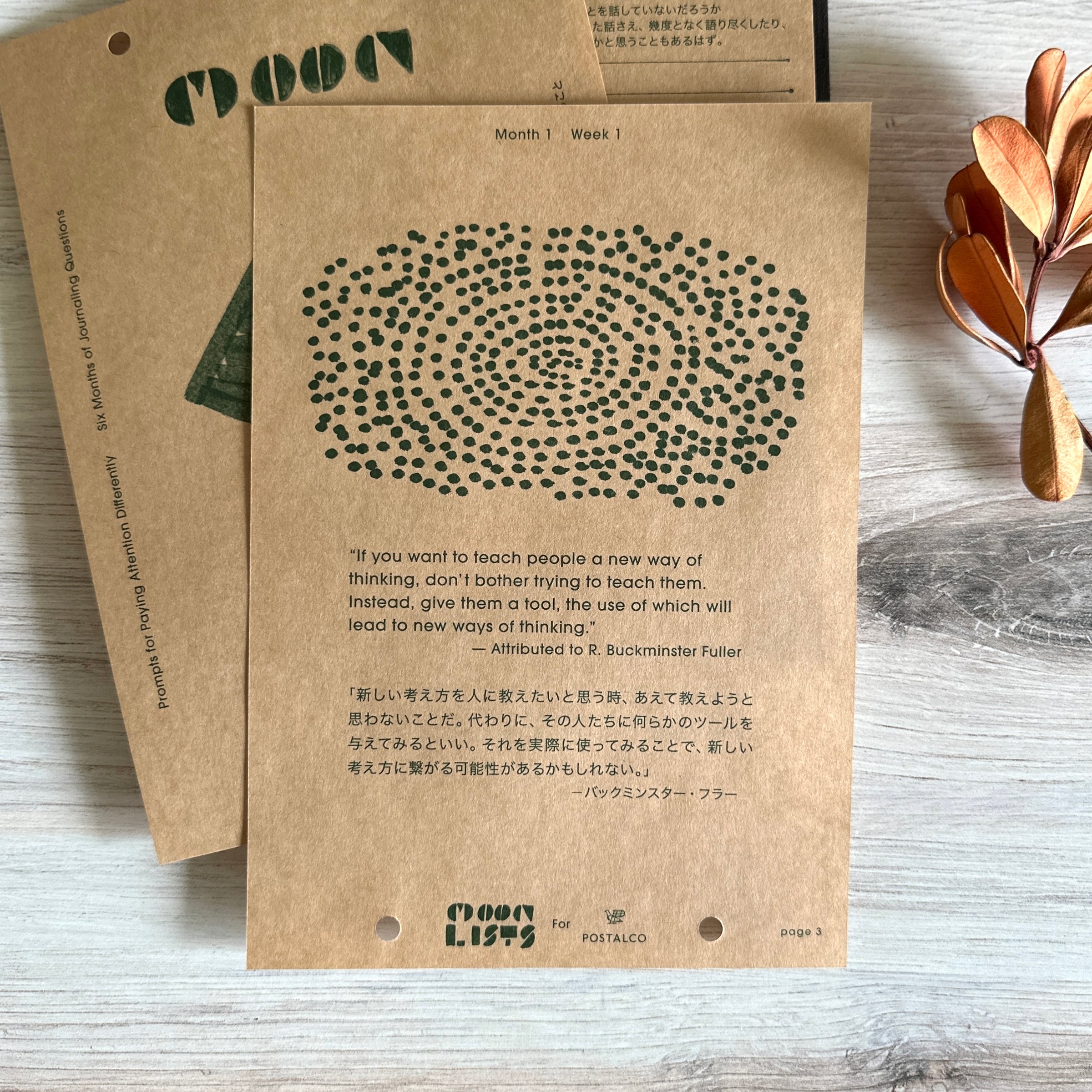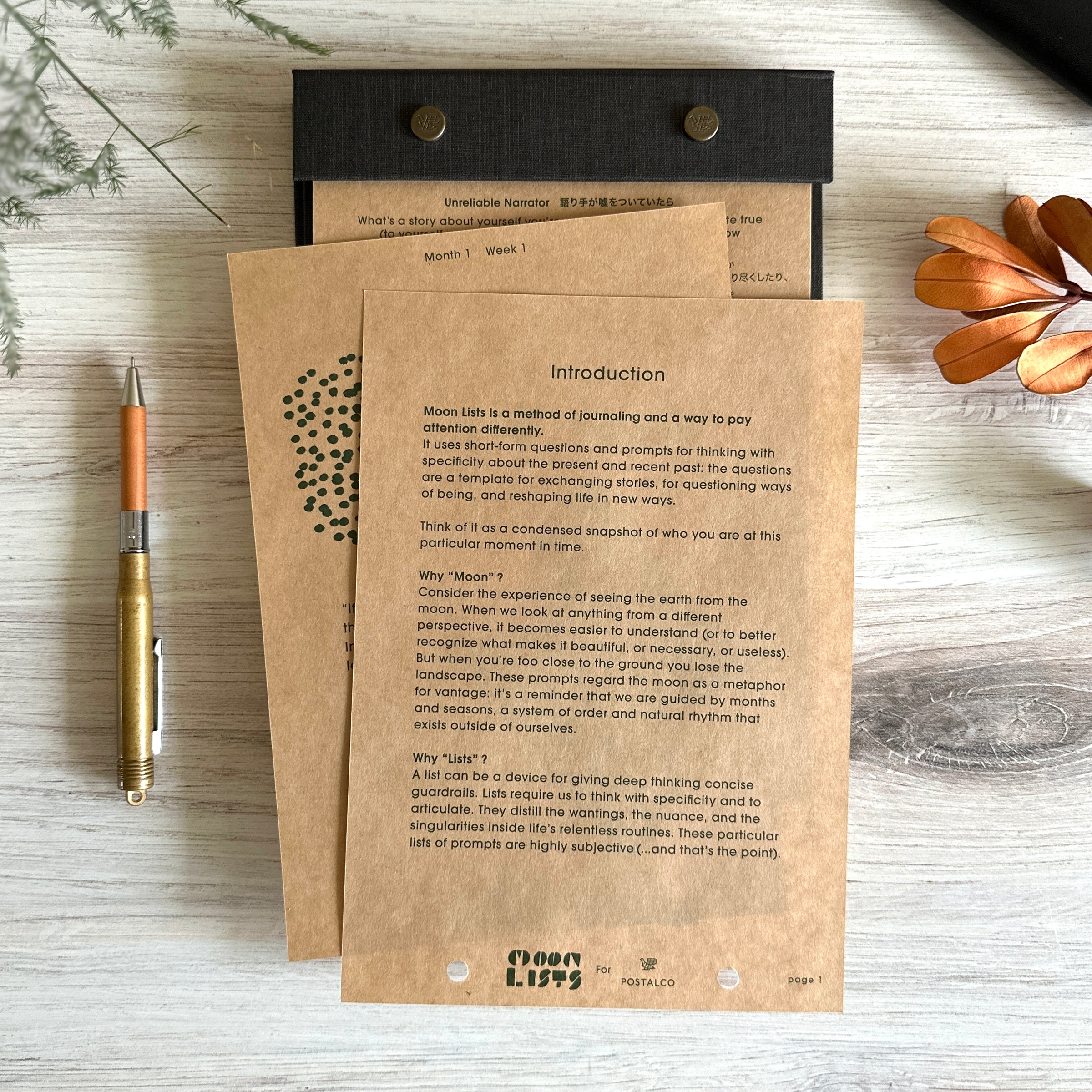 The Moon Lists is a gentle journaling practice designed to help you notice the present moment more closely and reshape your life stories. Through one short prompt each week, it invites reflection not on specific events that happened, but rather focuses on what’s unfolding within your mind. Enjoy documenting in a unique way that is free from pressure, and allows you to select any prompt in any order. Printed on beautifully tactile kraft paper, it offers a flexible space to explore both your inner our outer world.