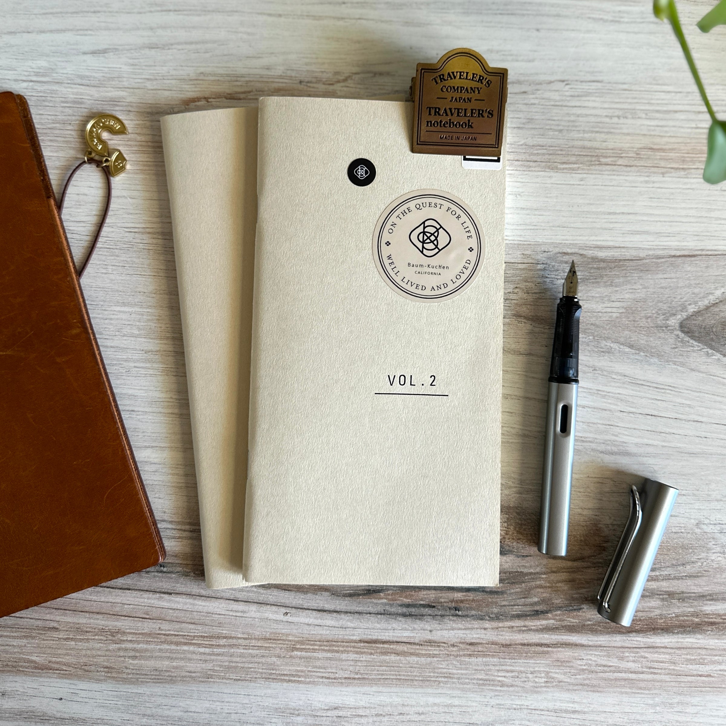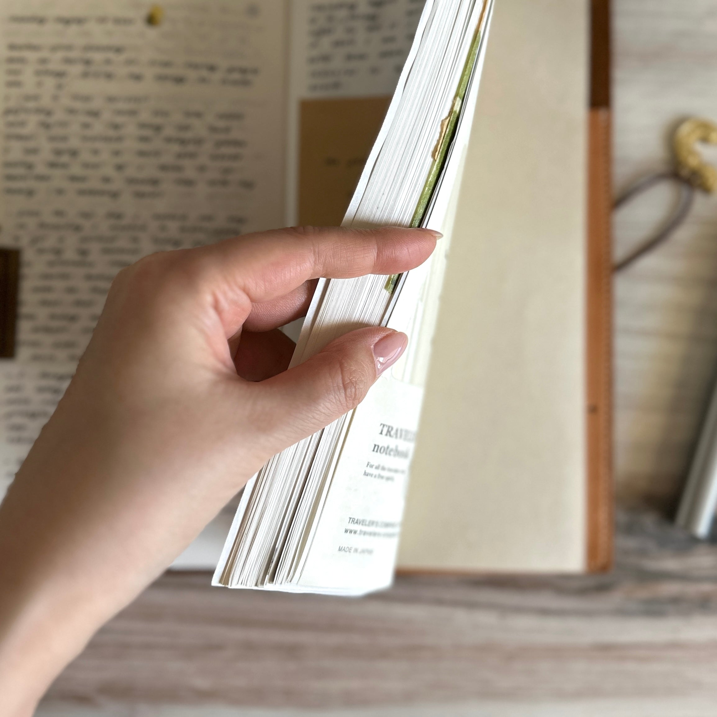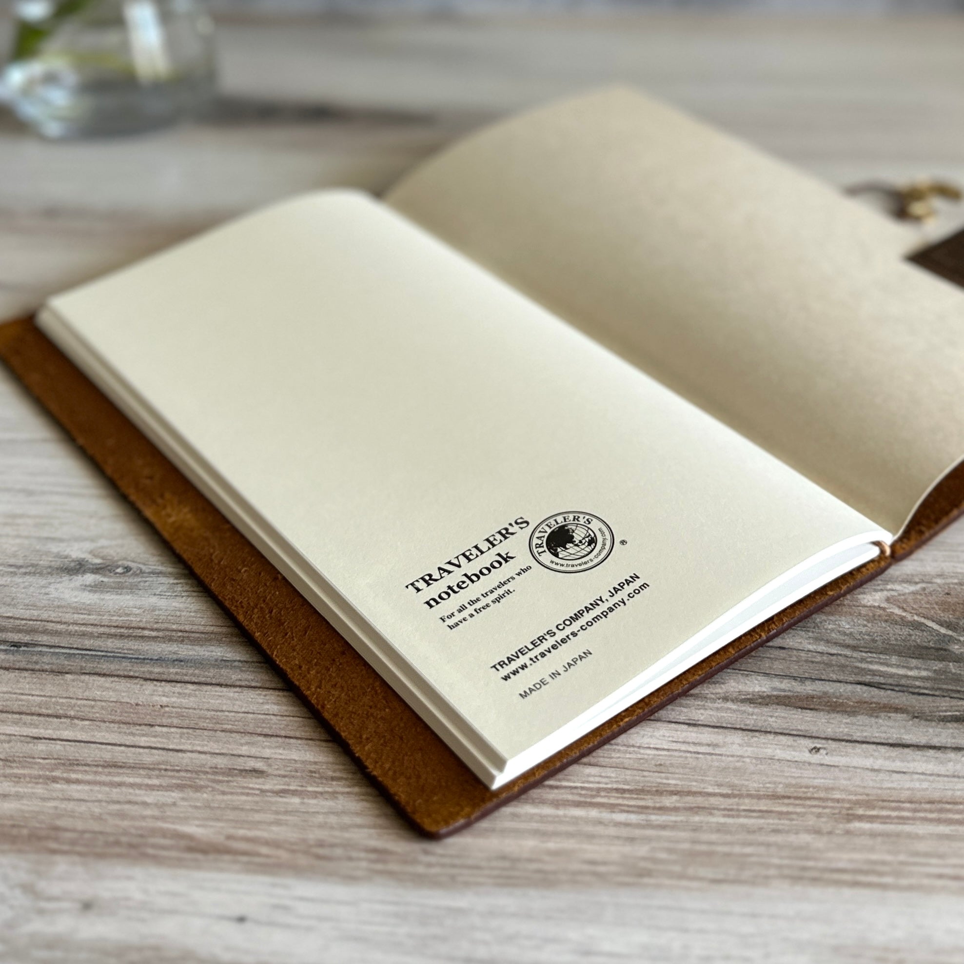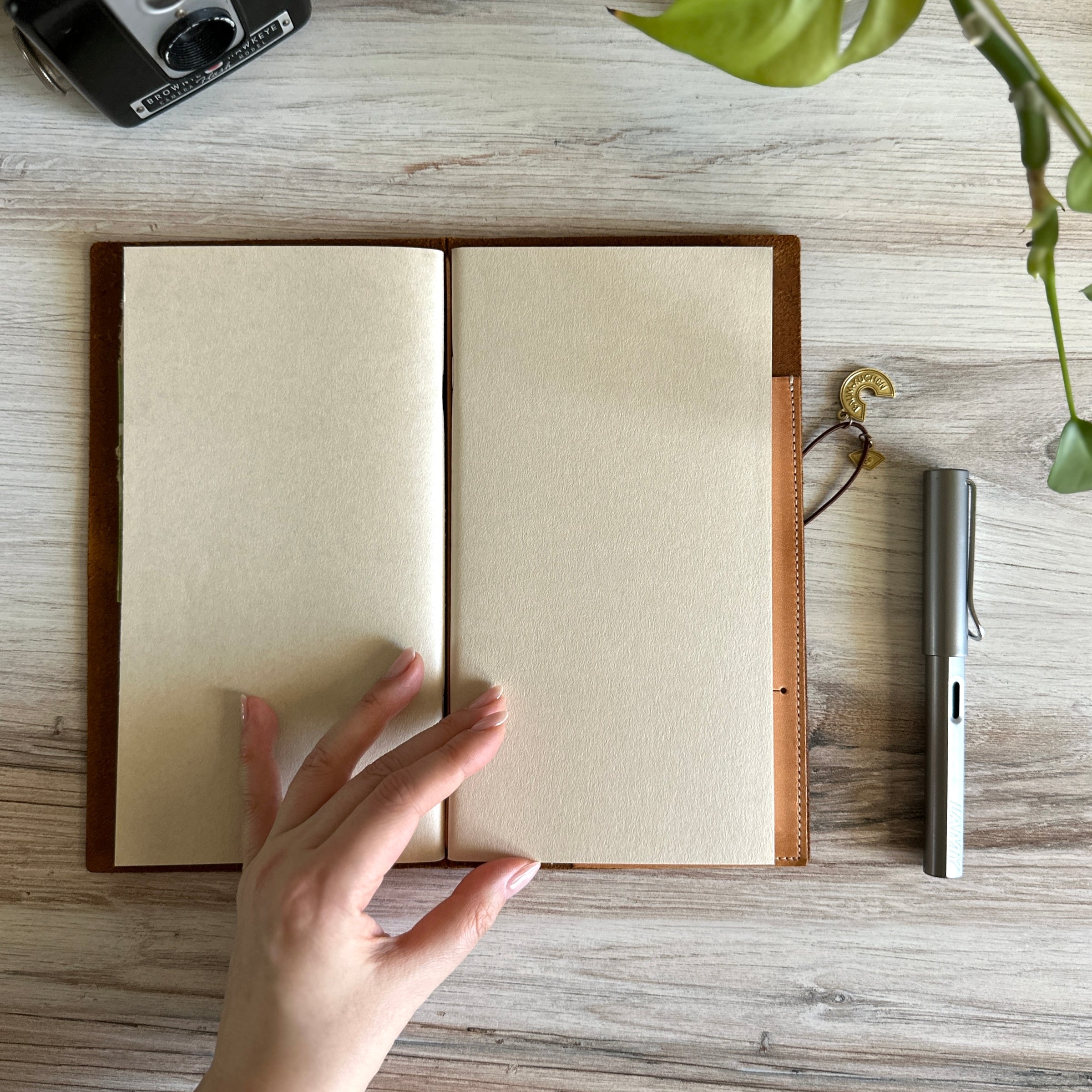 The notebook is packed with 128 blank pages of Tomoe River Paper. It is a fountain pen/ ink-friendly and lightweight, so even though it has substantial page counts, the notebook does not feel bulky in your Traveler's Notebook. You will be able to use this notebook for an extended period, making it perfect for someone who enjoys not having to swap refill notebooks frequently and love referencing past entries.