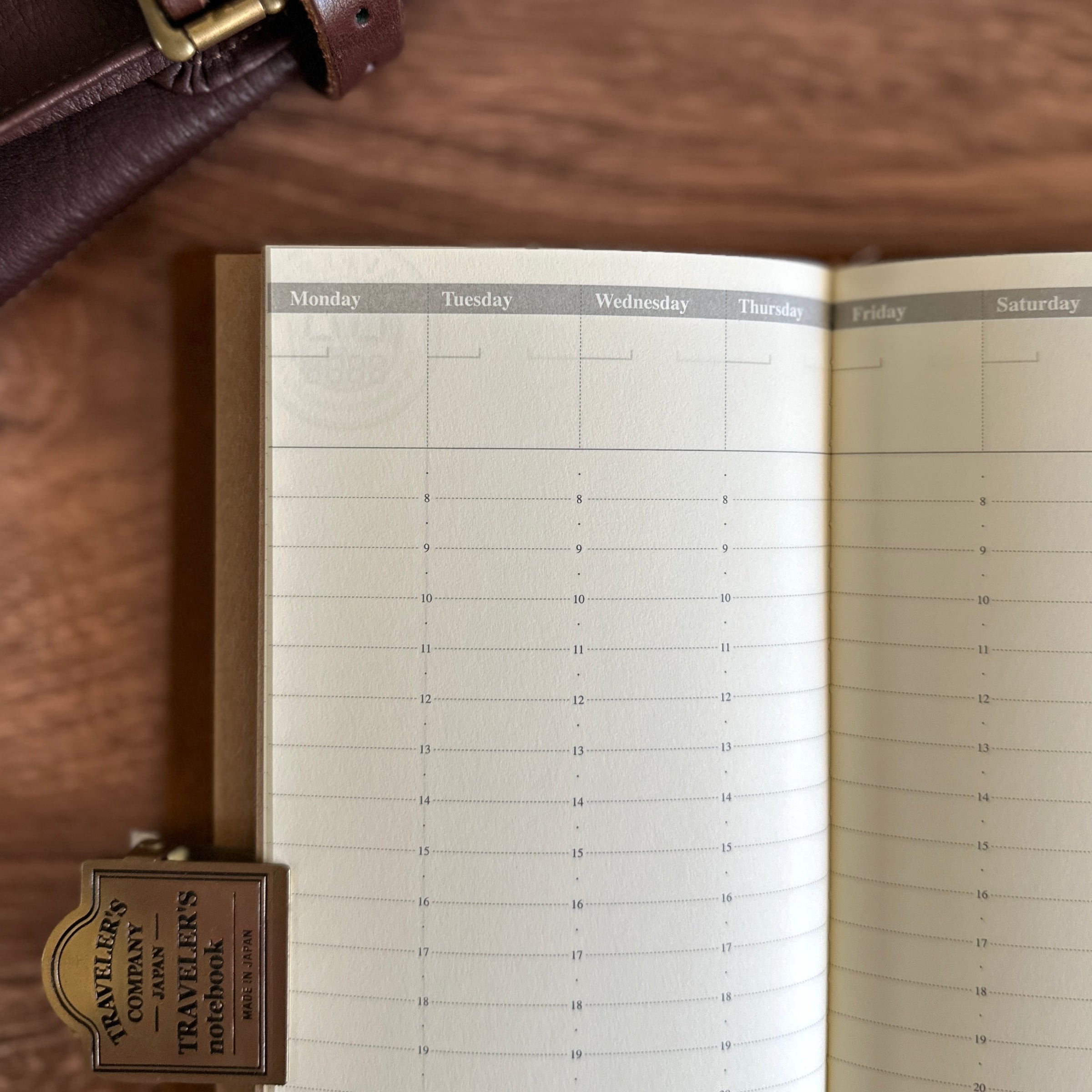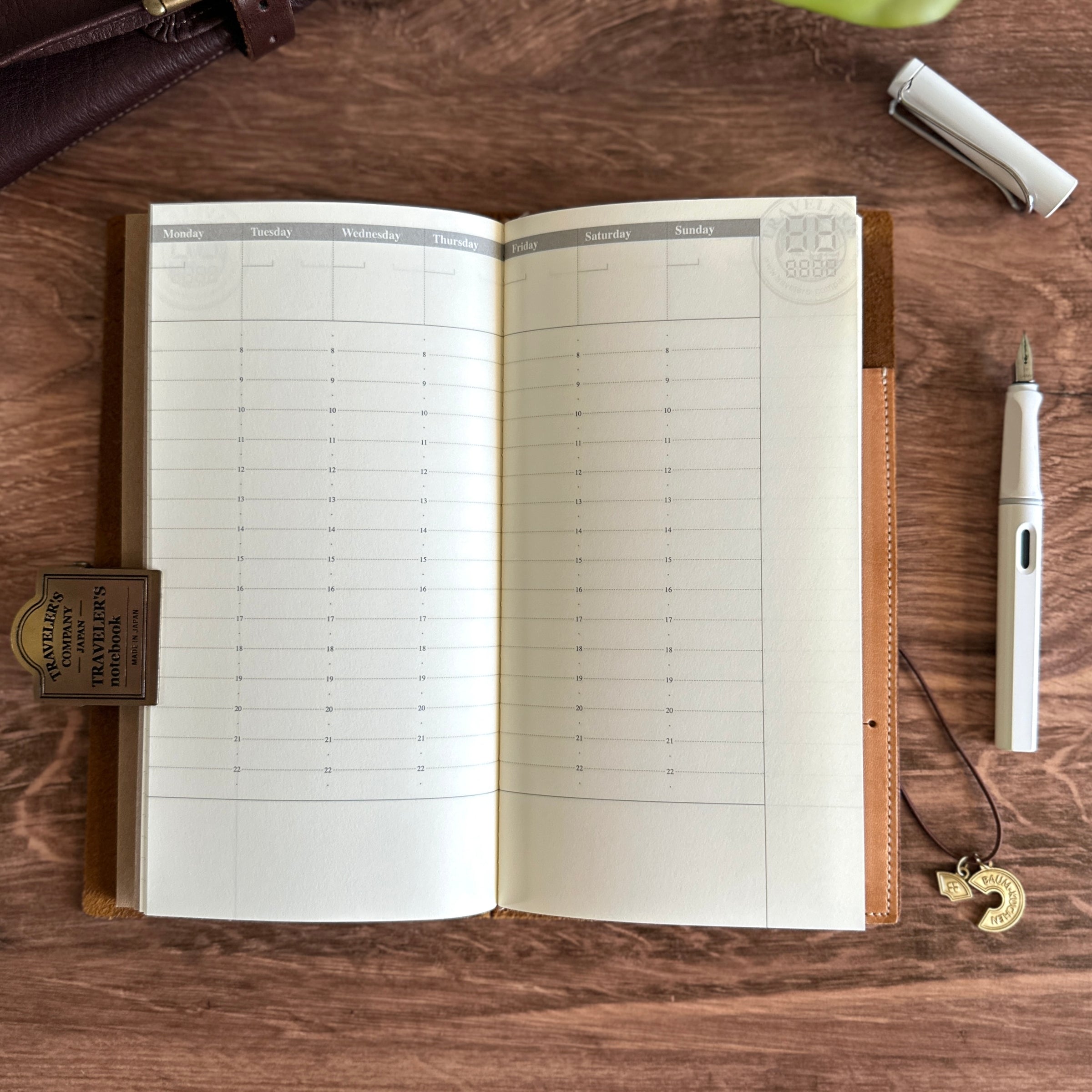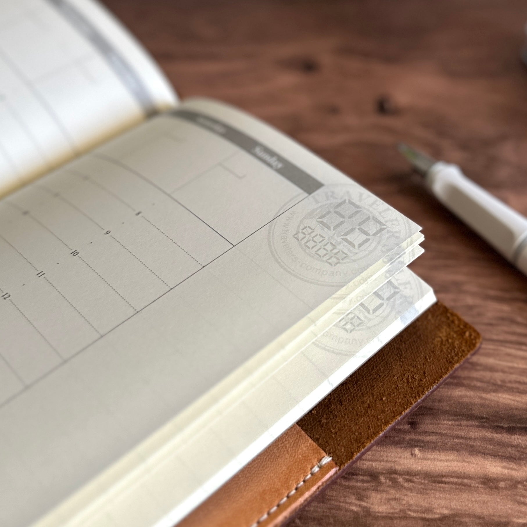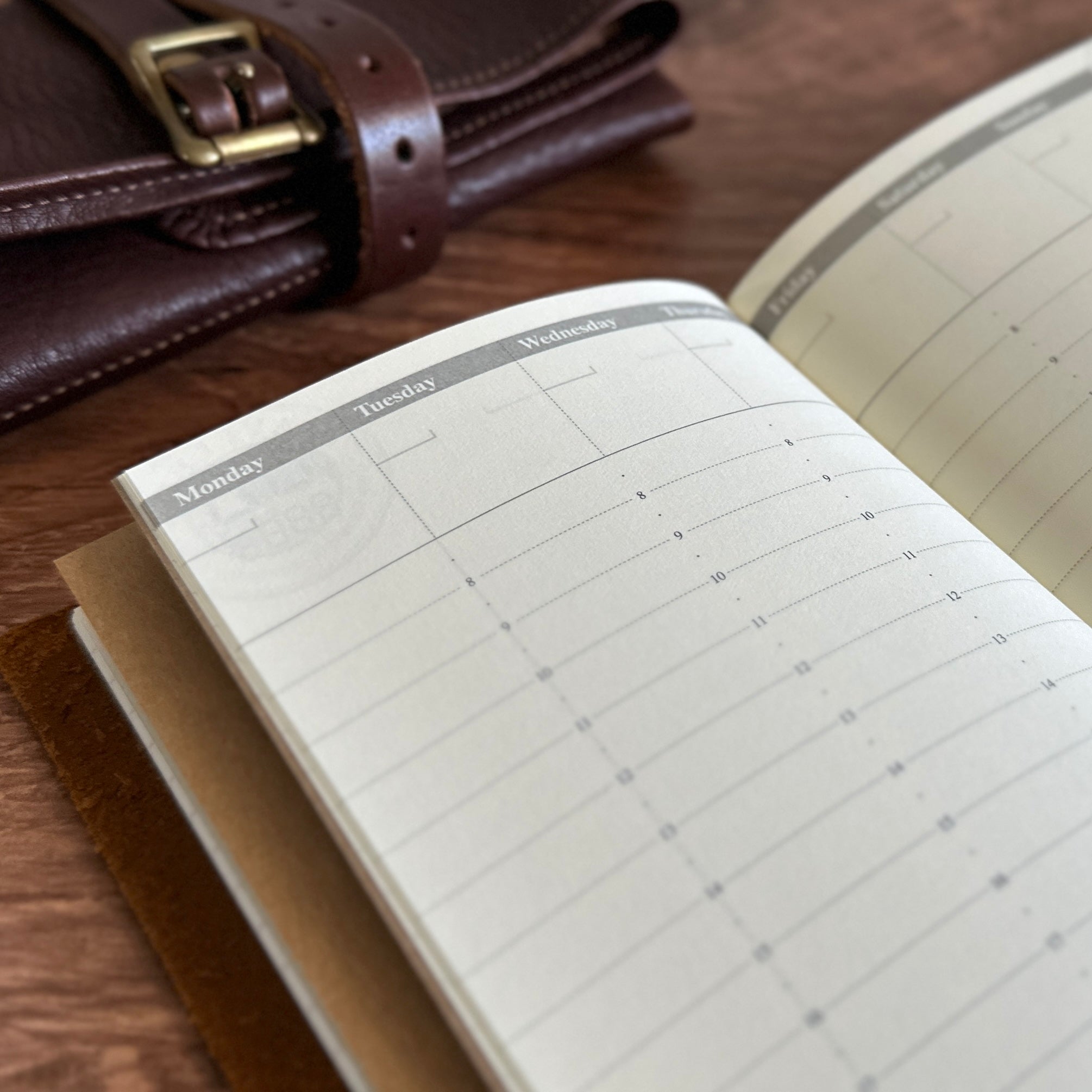 A refillable weekly diary is designed to accompany the Traveler's Notebook leather cover. It can be incorporated inside of the Traveler's Notebook system using the rubber band that comes with the leather cover
