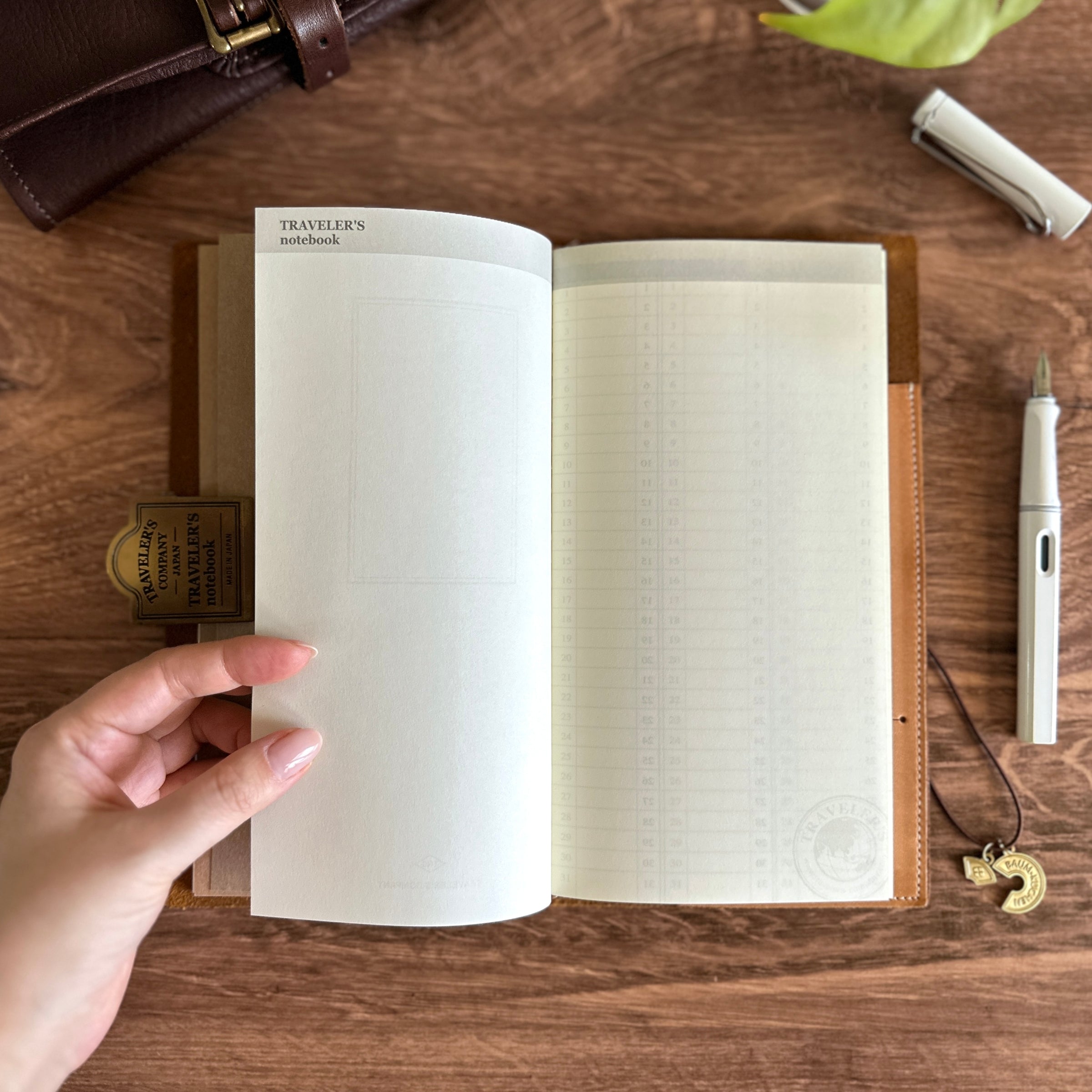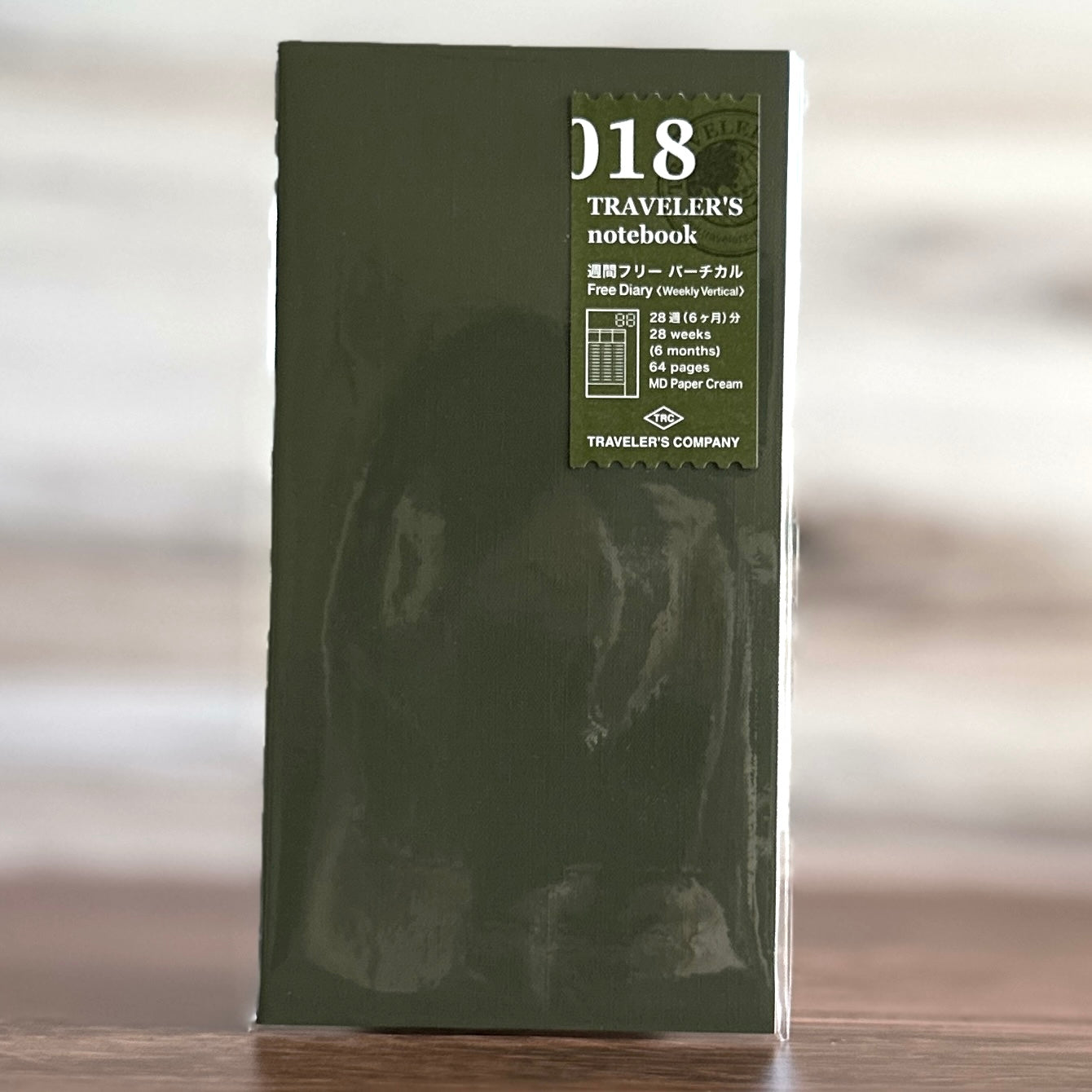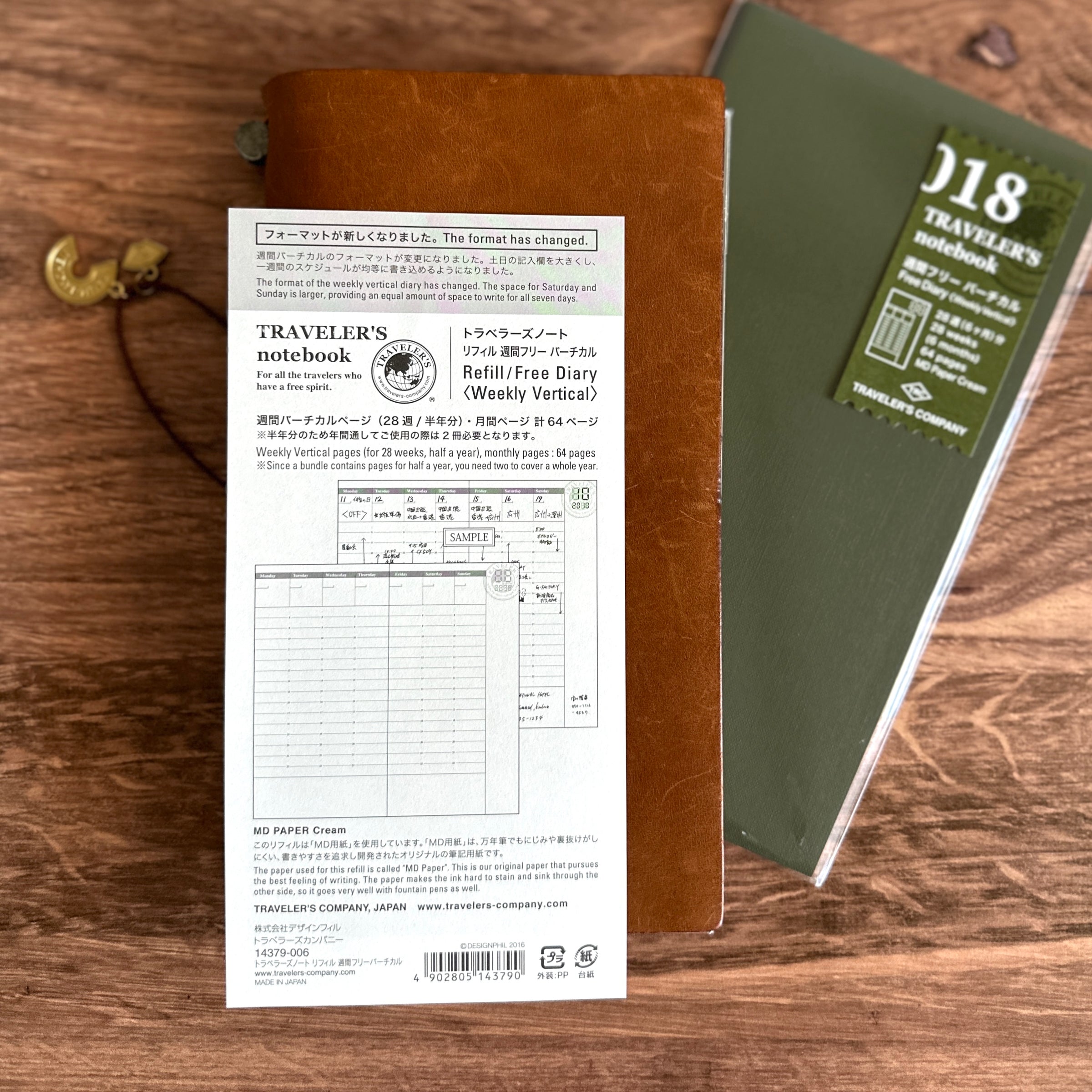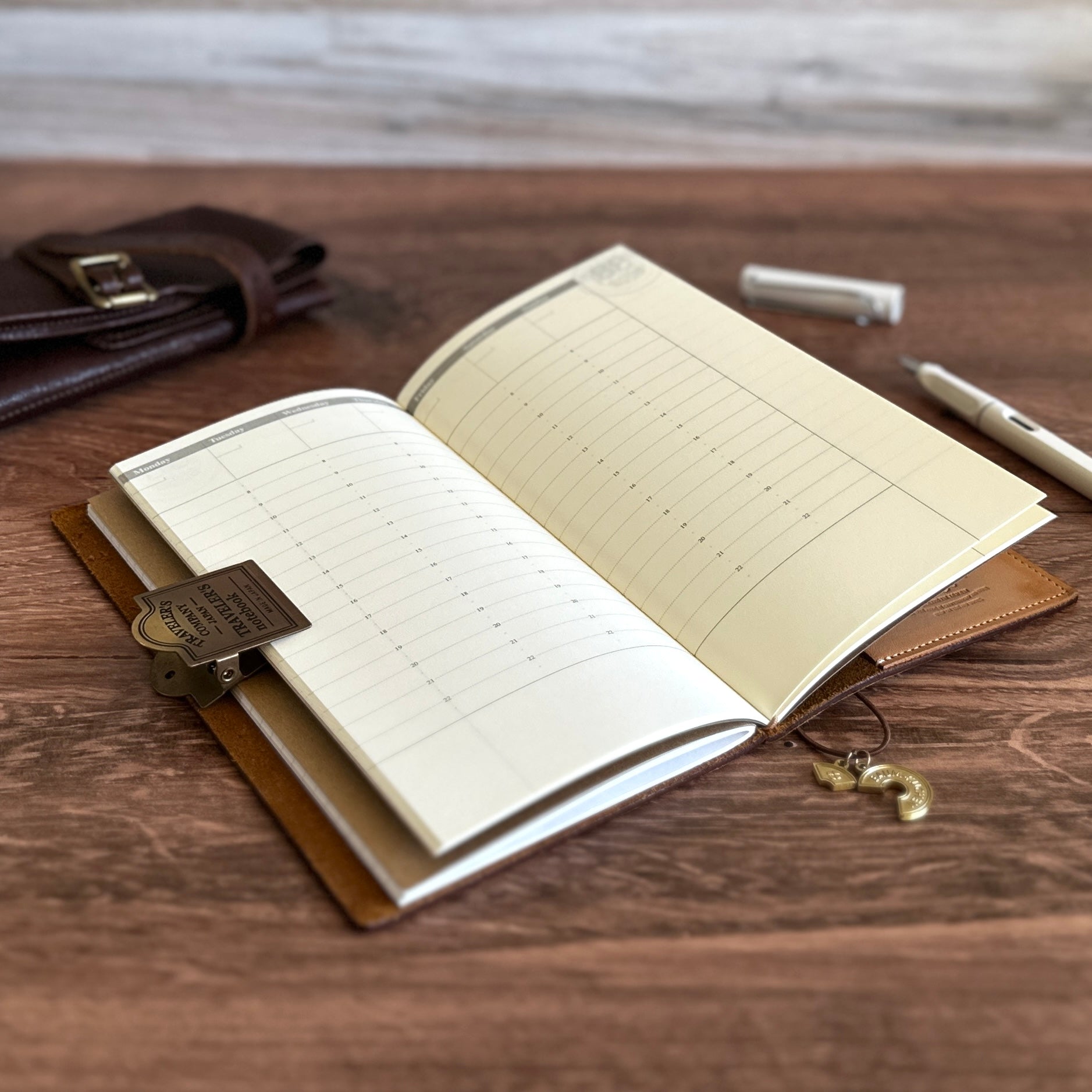 A refillable weekly diary is designed to accompany the Traveler's Notebook leather cover. It can be incorporated inside of the Traveler's Notebook system using the rubber band that comes with the leather cover