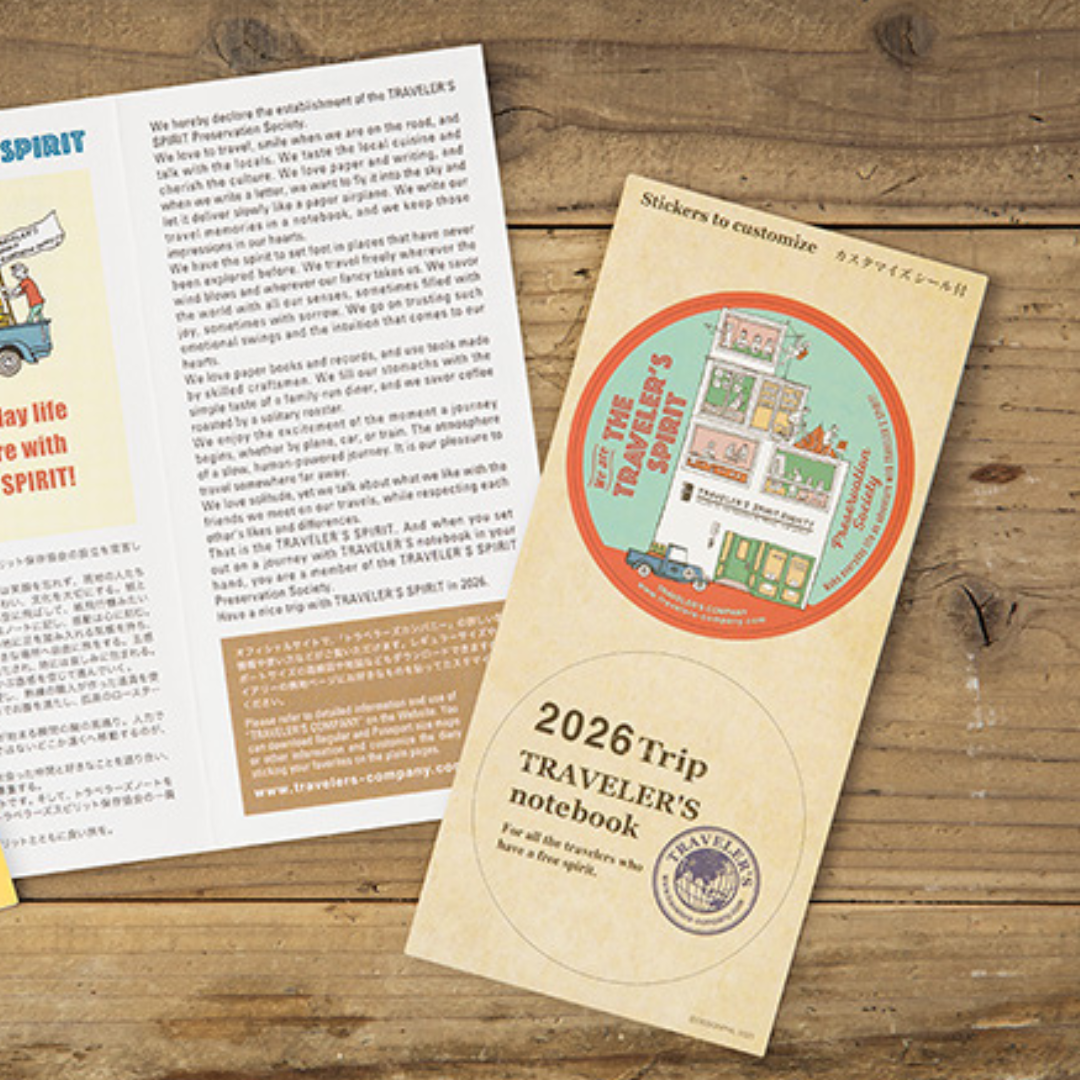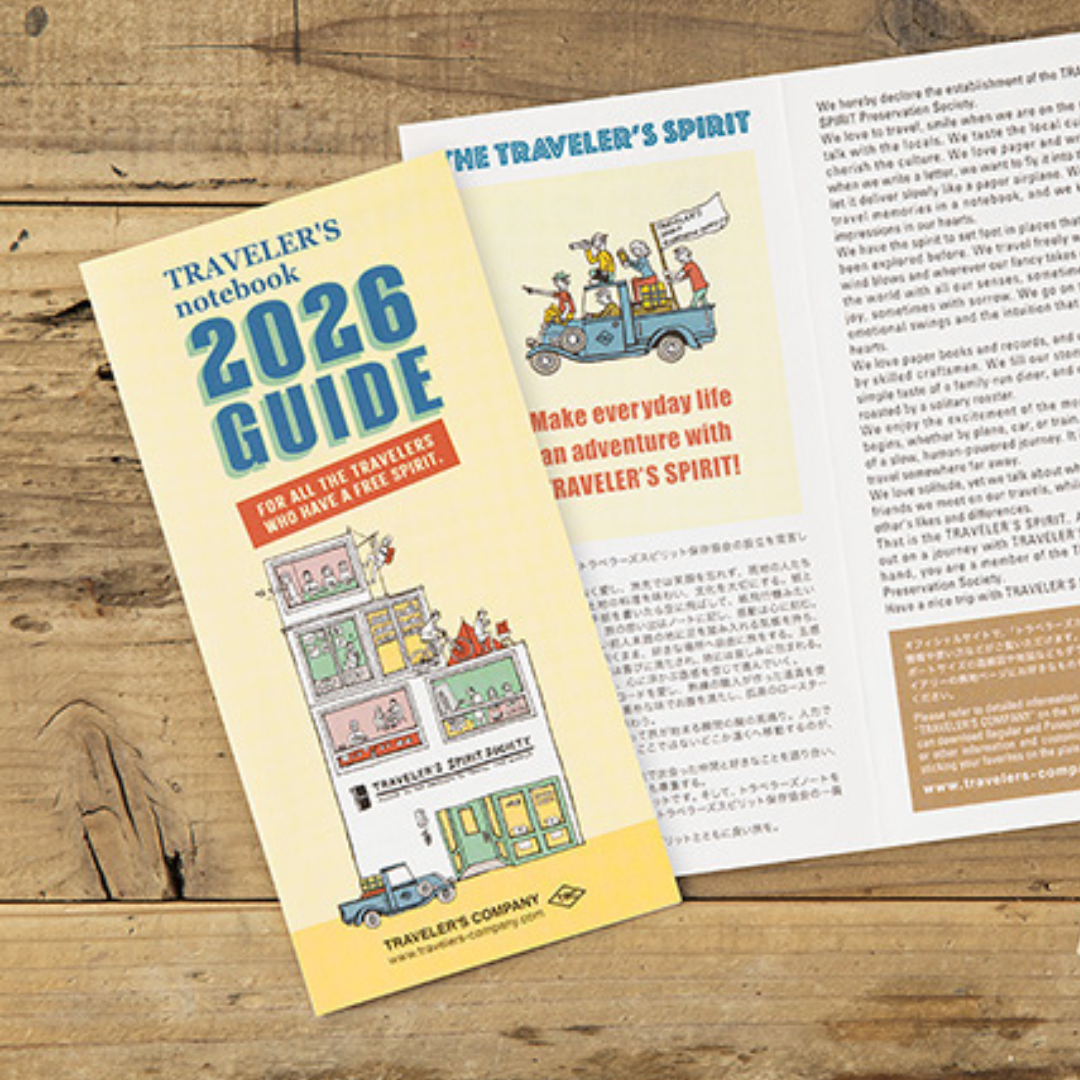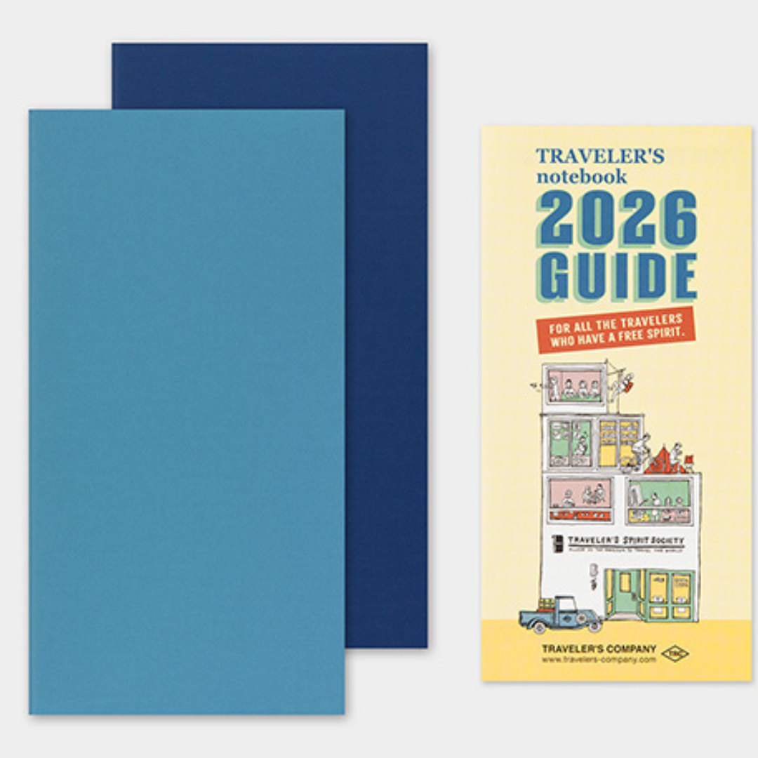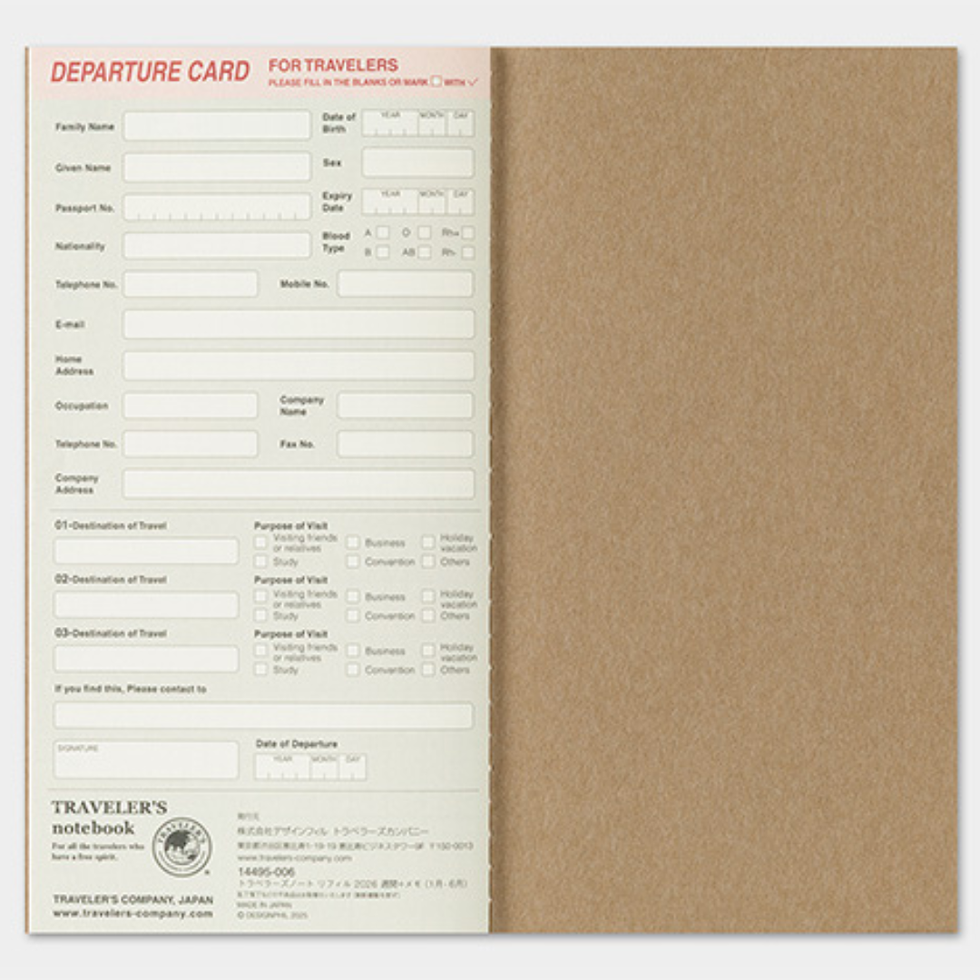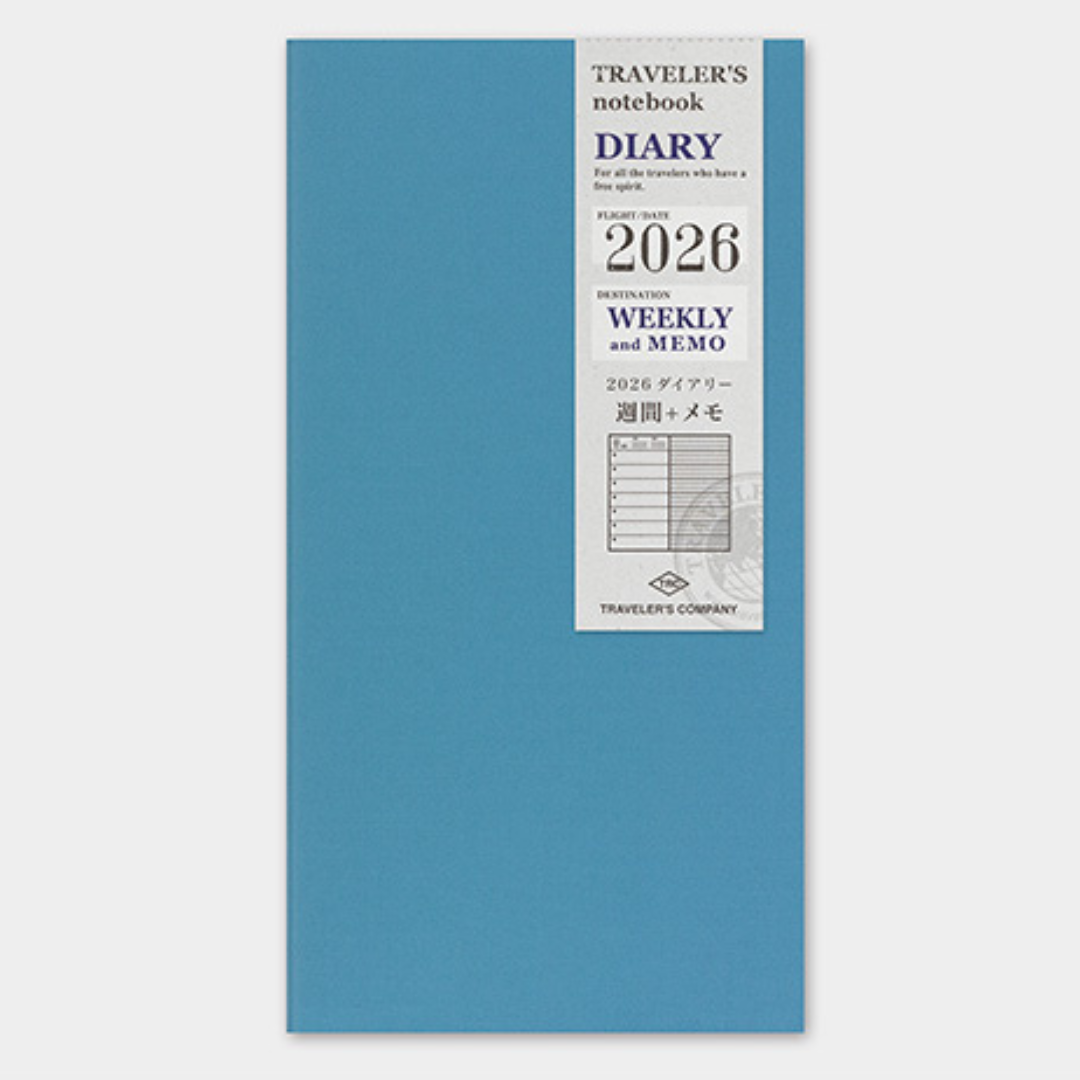 TN 2026 Weekly Grid + Memo Diary is designed to accompany your Traveler's Notebook. It can be incorporated inside the Traveler's Notebook system using the elastic band and leather cover.