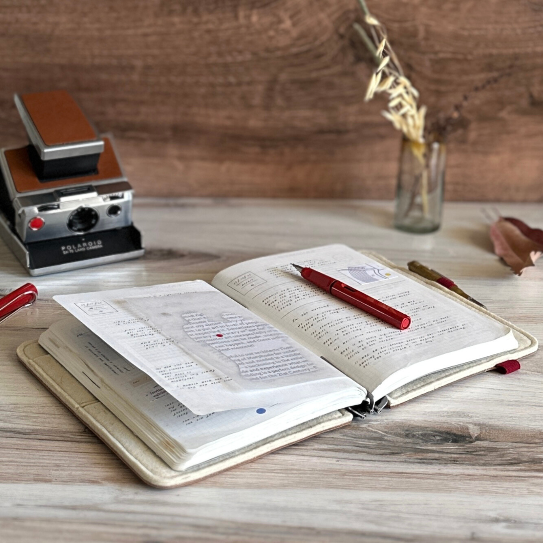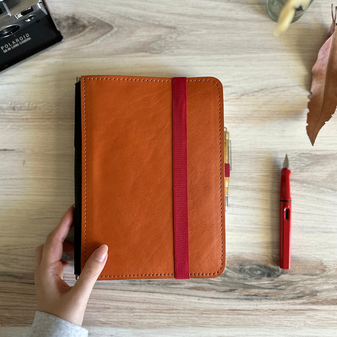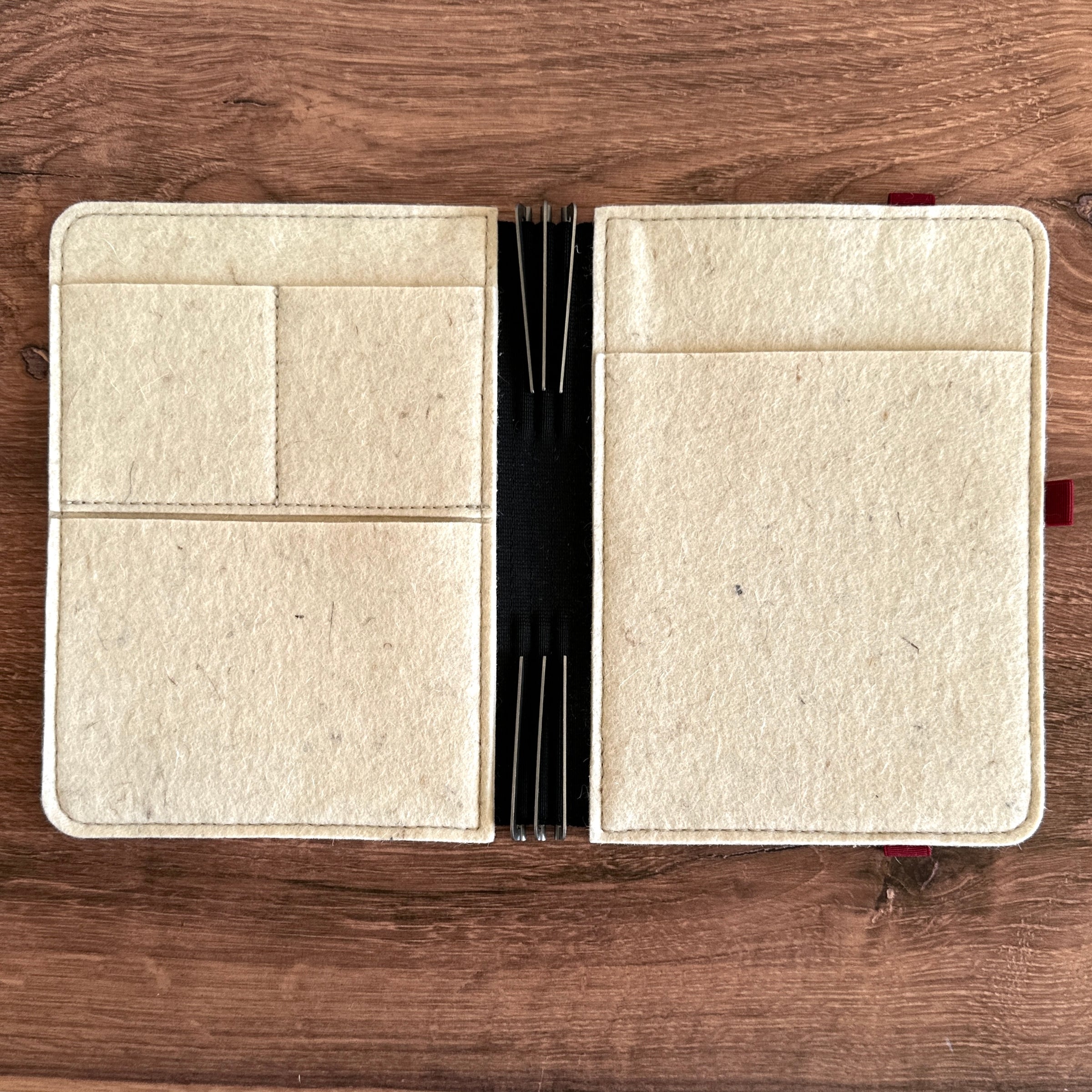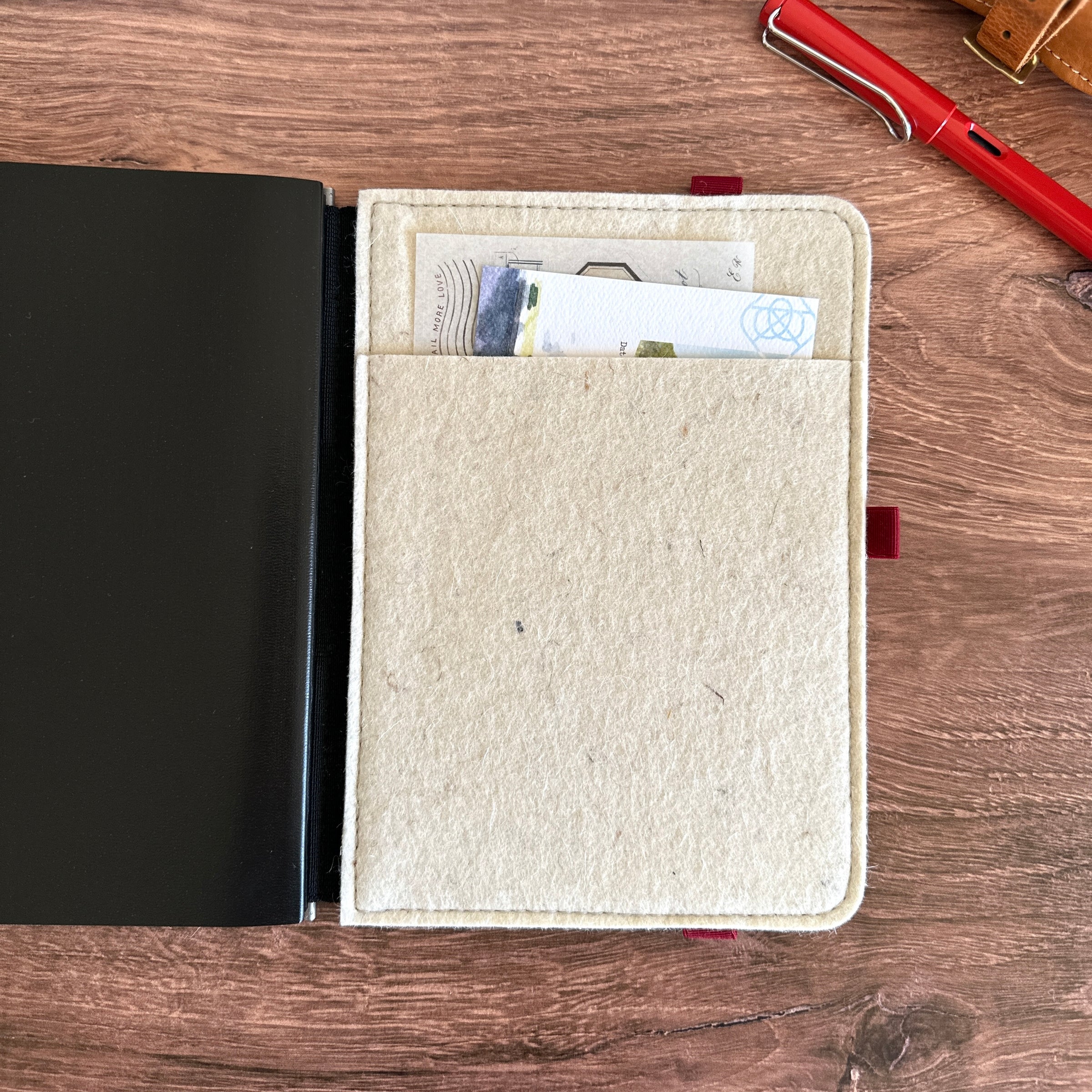 Its tactility comes from carefully selected Roterfaden materials. Outside cover is a vegetable tanned leather from Germany that is durable as well as beautiful and inside pockets are made out of 100% doable wool felt. Light brown leather and dark grey felt brings a sophisticated contrast to the Roterfaden's look and feel. The leather cover comes with a pen holder loop and elastic band in red in order to keep everything inside safe and secure.